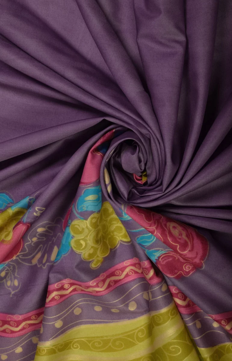 Olasz ing pamut lila színben, gyümölcs motívummal a szövet egyik szélén - körkörösen varrjuk.