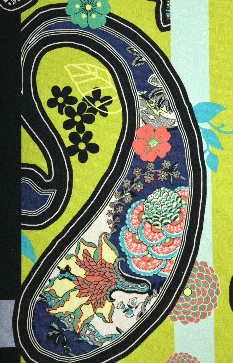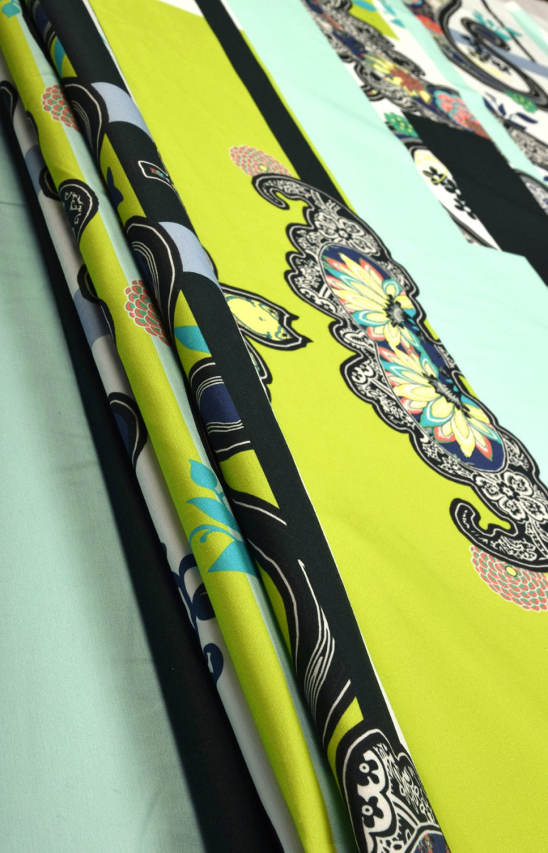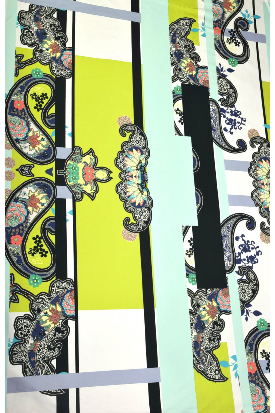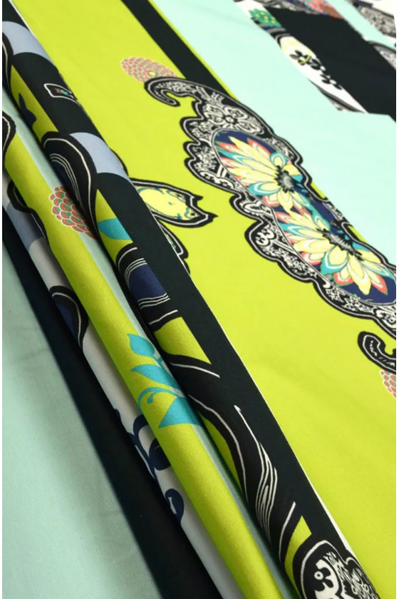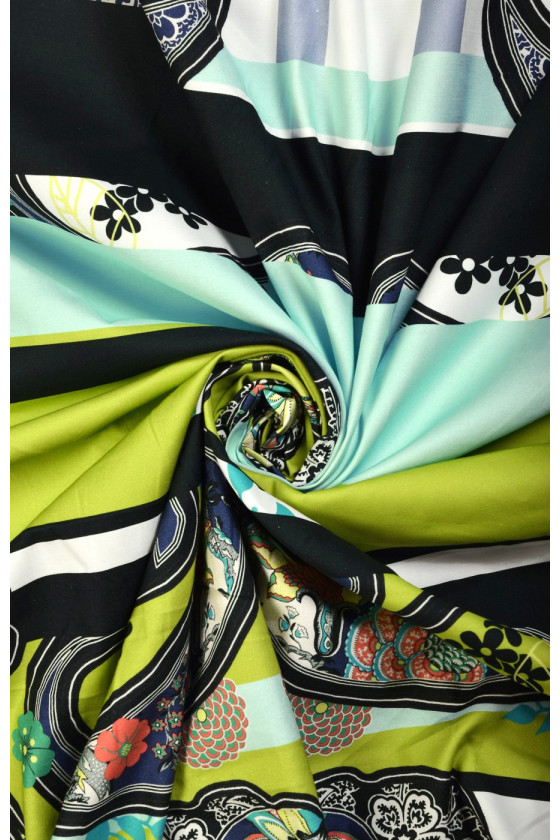 Olasz pamutszövet spandexszel kuponméretben 90cm * 150cm. Gyönyörű keleti motívum zöld, szürke, fekete és világos türkiz árnyalatokban.