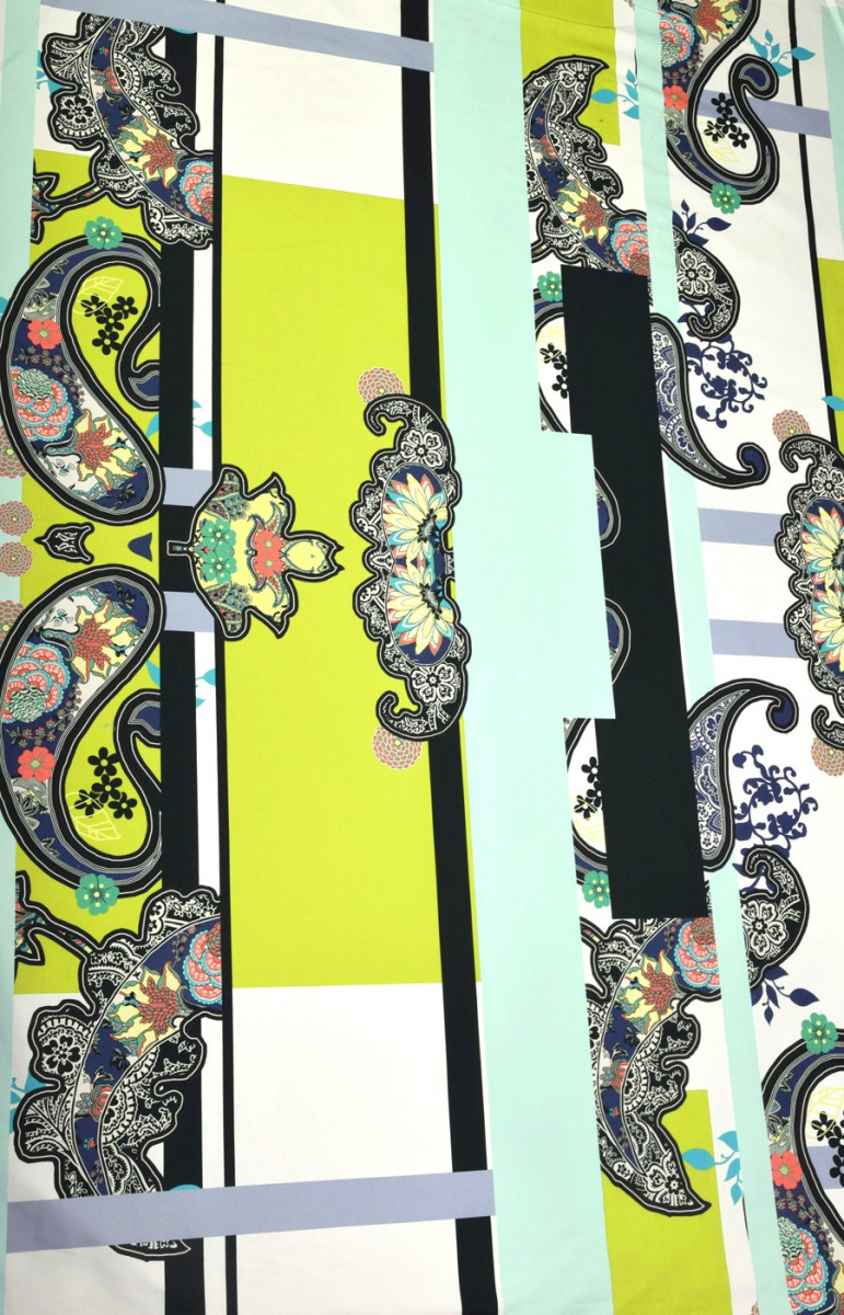 Olasz pamutszövet spandexszel kuponméretben 90cm * 150cm. Gyönyörű keleti motívum zöld, szürke, fekete és világos türkiz árnyalatokban. Tökéletes szoknya, ruha vagy nadrág varrásához.