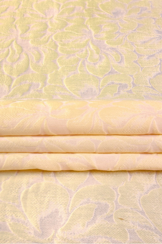 Vanília jacquard dombornyomott virágmintával. A szövet szerkezete ideális elegáns ruhák és szoknyák varrásához. Dekoratív szövetként is használható.