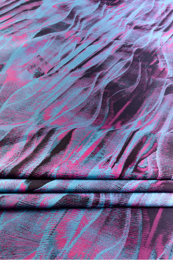 Elegáns jacquard türkizkék fuksziával és fekete, gyönyörű átlós mintával, amely hullámmotívumot hoz létre, kissé merev. Tökéletes ruhák, szoknyák és dzsekik varrásához. Kérjük, tisztítsa meg vegyen!