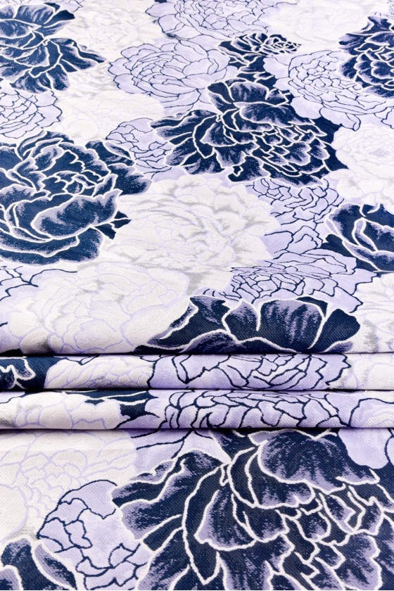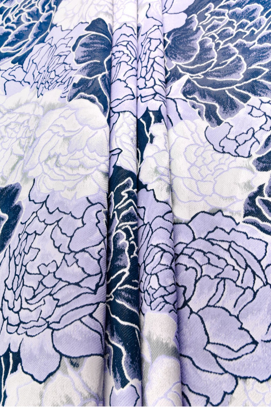 Jacquard nagy sötétkék, levendula és szürke virágokkal. Az anyag gyönyörűen illeszkedik egy formális ruha, szoknya, kabát, kabát javaslataként. Kérjük, tisztítsa meg vegyen!
