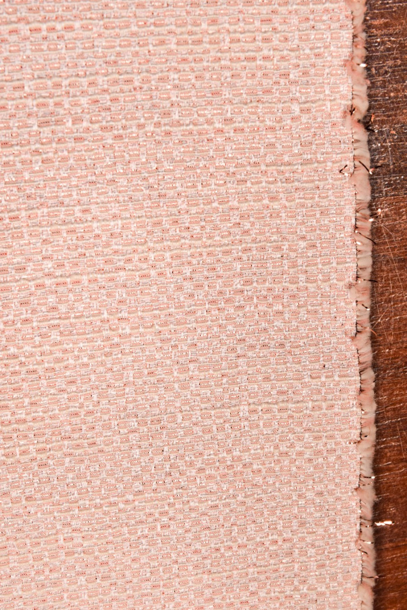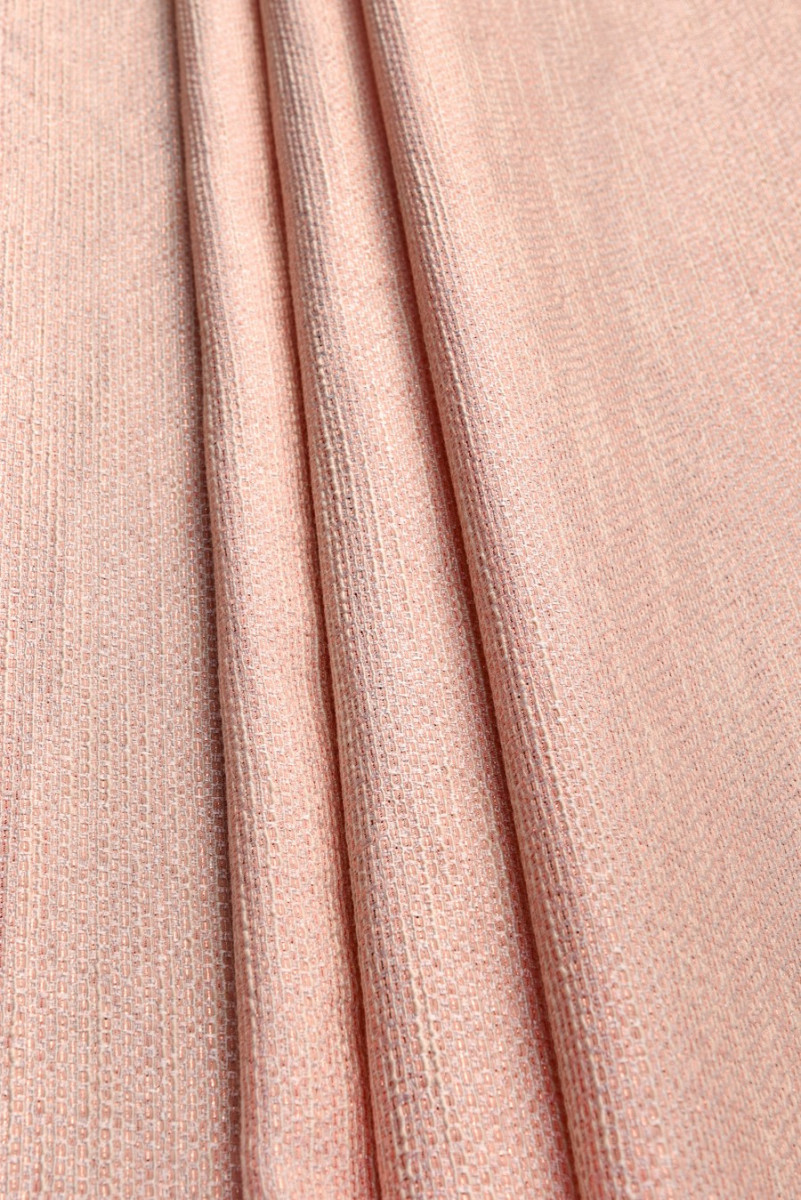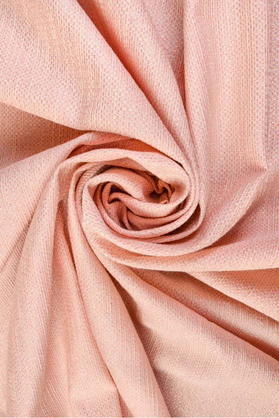 Olasz jacquard jelmezszövet lazac színben. A tiszta szövésű anyag, amely szerkezetet ad, az egészet fényes szál díszíti rózsaarany színben. A szövet nagyon finom mintázattal rendelkezik, amelyet finom ragyogás tesz hatékonyabbá. Tökéletes klasszikus jelmez, ruha, szoknya varrására vagy dekoratív anyagként.