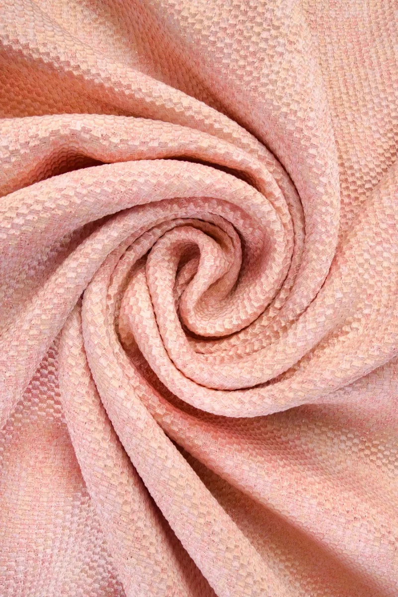 Olasz jacquard jelmezszövet lazacsárga színben. Finom, dombornyomott geometriai mintával rendelkező szövet, amely hasonlít a lépekre. Az egészet fényes aranyszál díszíti, ami eleganciát és kifinomultságot kölcsönöz neki. Nagyon finom javaslat kabát, jelmez vagy dekoratív szövet varrására.