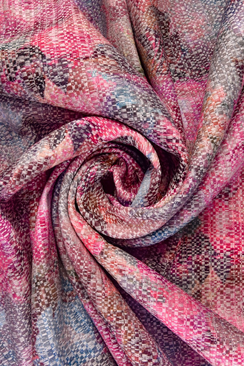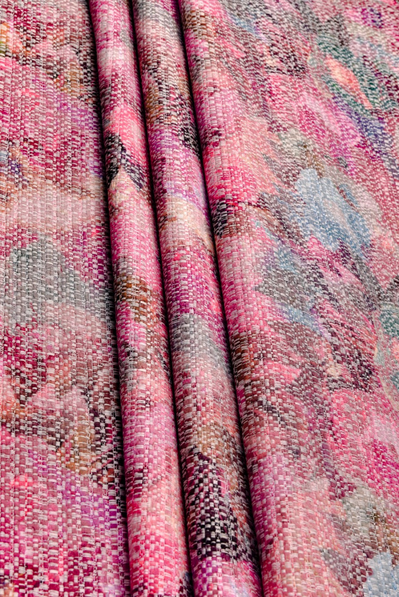 Olasz jacquard jelmezszövet vastag, tiszta szövéssel. Nagyon lenyűgöző nagy, festett virágok mintája. A domináns színek itt a fukszia és a rózsaszín, kék, zöld és bordó elemekkel. Nagyszerű javaslat elegáns jelmez, ruha, szoknya varrására. A szövet díszítésre is használható.