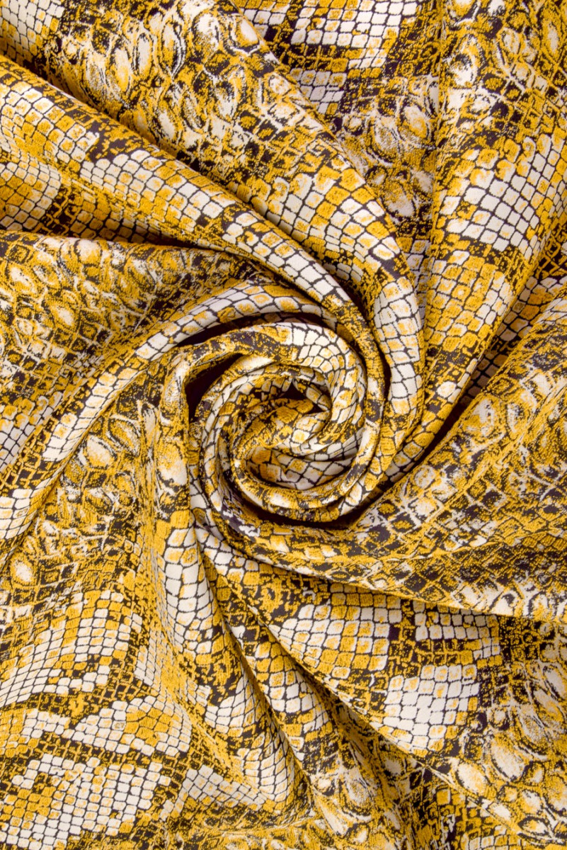 Rugalmas jacquard gyönyörű kígyómintával, szürke-mustár-fekete színben. A szövet szerkezete ideális ruhák, szoknyák, nadrágok varrására