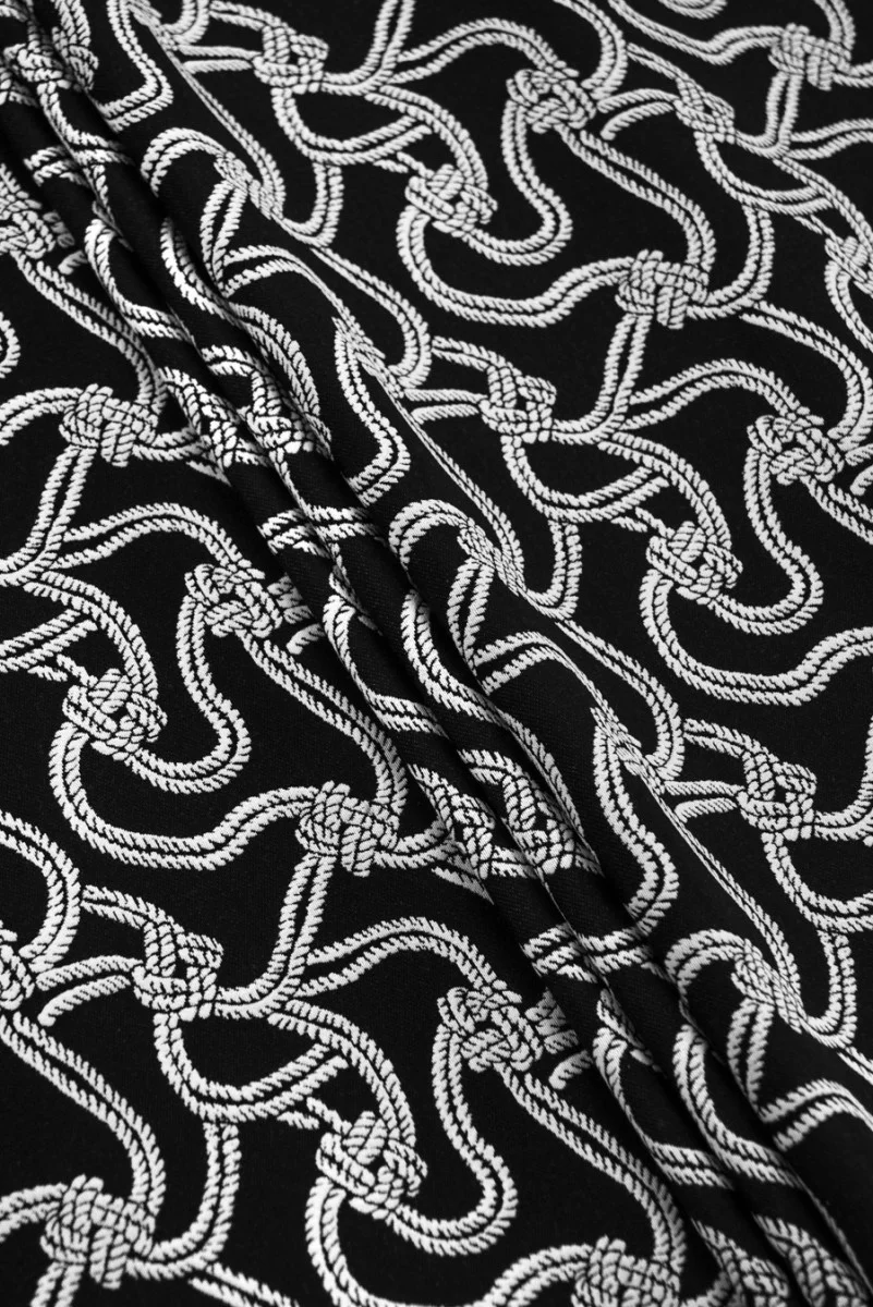 Olasz jacquard jelmezszövet. Nagyon érdekes, sűrű fehér zsinór mintázat csomókkal fekete alapon, a bal oldalon ellentétes színű - fekete zsinórok fehér alapon, és varrásra is használhatók. Az anyag nem rugalmas, közepes vastagságú, matt szövésű - hasonlít a farmerre. Tökéletes szoknya, kabát vagy ruha varrására.