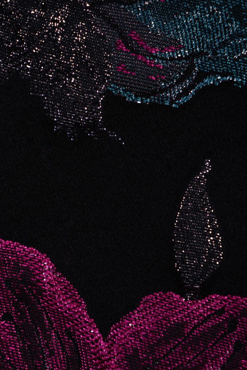 Olasz jacquard jelmezszövet sűrű virágmotívummal. A szövet háttere fekete színben készült, sűrű szürke mintával, fukszia és türkiz virágokkal, az egészet ezüst, fényes cérna díszíti. Az anyag nem rugalmas és enyhén merev, tökéletes elegáns öltöny, ruha vagy jelmez varrásához.