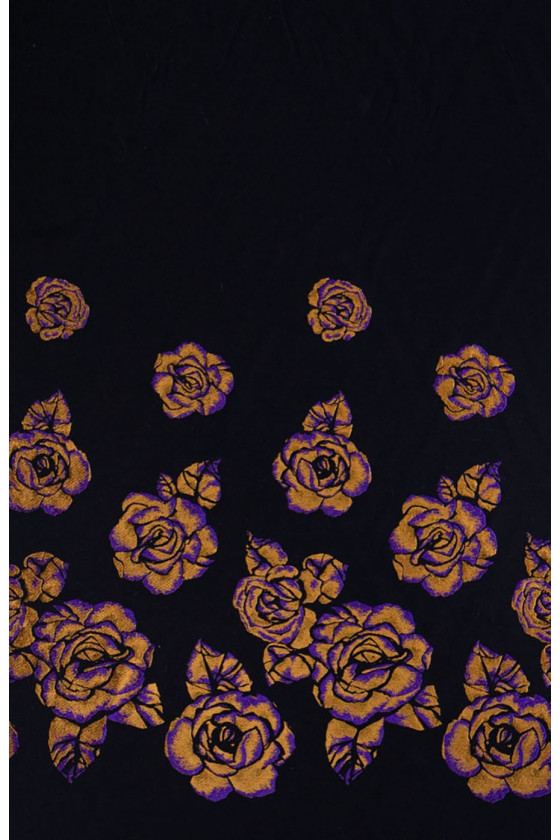Olasz jacquard szövet, fényes, arany-lila virágok motívumával fekete alapon. A szövet 120 cm * 150 cm méretű kuponban kerül forgalomba.