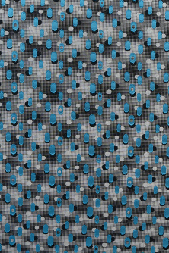 Olasz jacquard jelmezszövet. Egy kicsi, fehér és szürke csirkeláb motívuma, szabálytalan pöttyökkel (1,5 cm - 4 cm) fekete, szürke és türkiz színben.