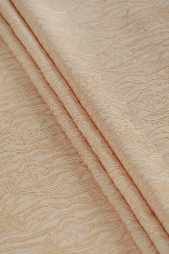 Olasz jacquard jelmezszövet bézs színben, arany lurex szállal. Nagyon érdekes motívum, amely hullámokra hasonlít.