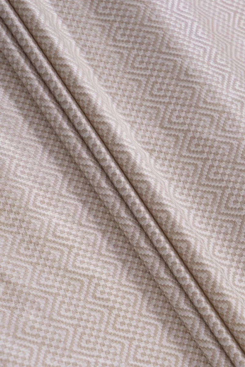Olasz jacquard jelmezszövet ballonkabátokhoz. Nagyon érdekes motívum a krém és bézs színű cikk-cakk motívum, amely vízszintes csíkokat hoz létre. Az anyag sima, enyhén fényes szövésű. Az anyag nem rugalmas, enyhén merev, enyhe fényű (vastagsága és merevsége hasonlít a taftra).
