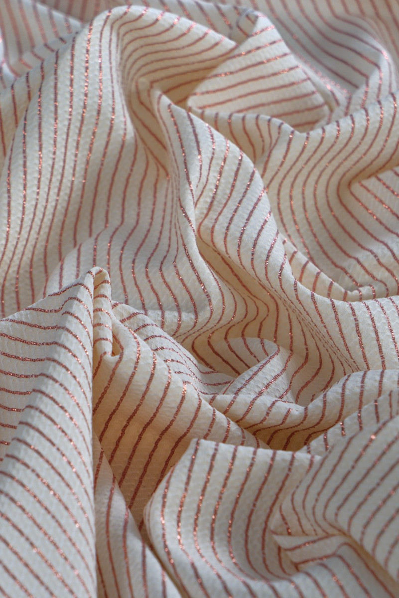 Olasz jacquard jelmezszövet ekrü színben, fényes rézszálból készült varrással. Körülbelül 0,7 cm széles vízszintes csíkokat képeznek. Az anyag enyhén merev, nem rugalmas, elegáns - tökéletes ruha, szoknya, jelmez vagy kabát varrásához.