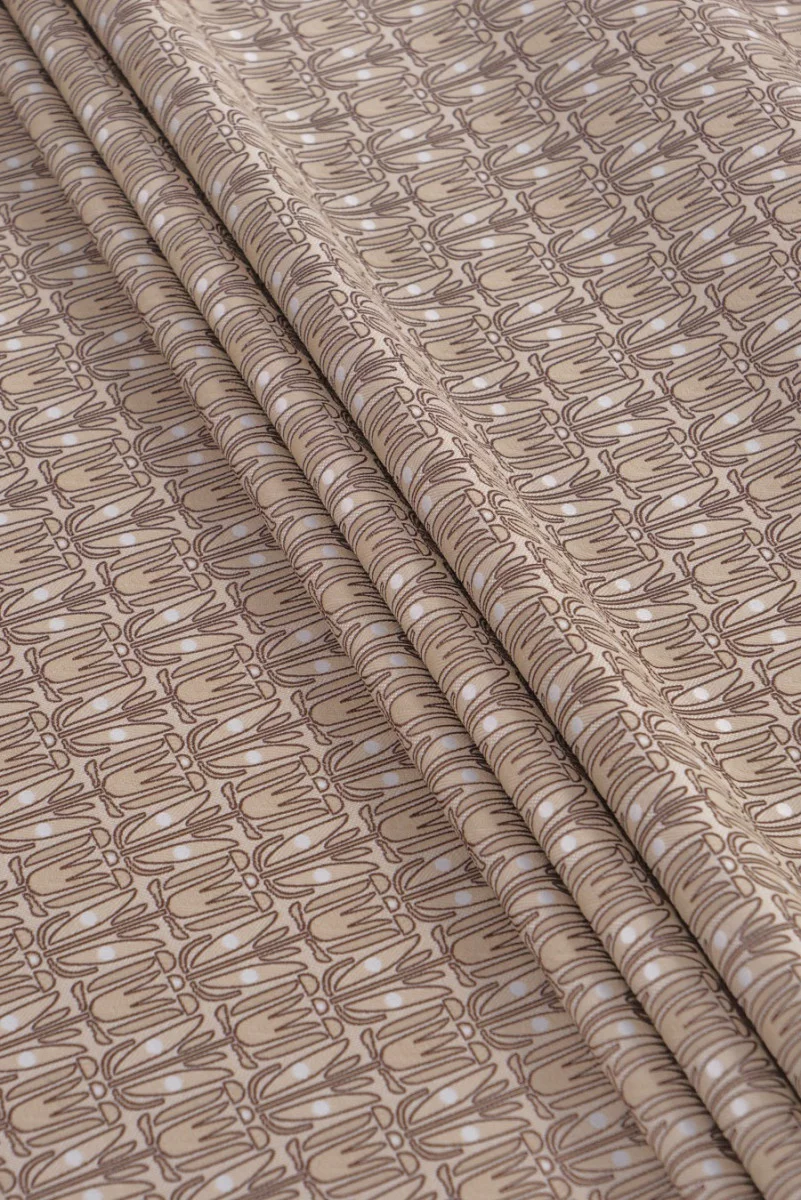 Olasz jacquard jelmezszövet bézs-barna színben. Nagyon érdekes motívum kicsi, sűrű virágokból, amelyek felváltva vannak elrendezve, egymást metsző csíkokat hozva létre. A szövet háttere világos bézs színű, sötétebb virágokkal, barna kerettel. Az anyag rugalmas, vékonyabb - tökéletes testhezálló ruha, nadrág vagy jelmez varrásához.