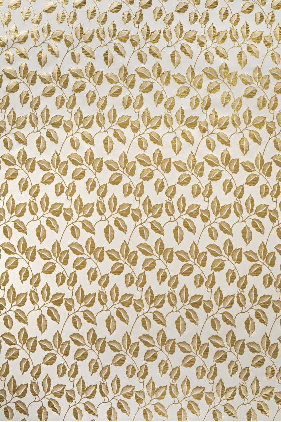 Olasz jacquard jelmezszövet világos bézs színben, arany levelek motívumával. A szövet nem rugalmas, merev, nagyon hatékony. Pamut/selyem keverék.