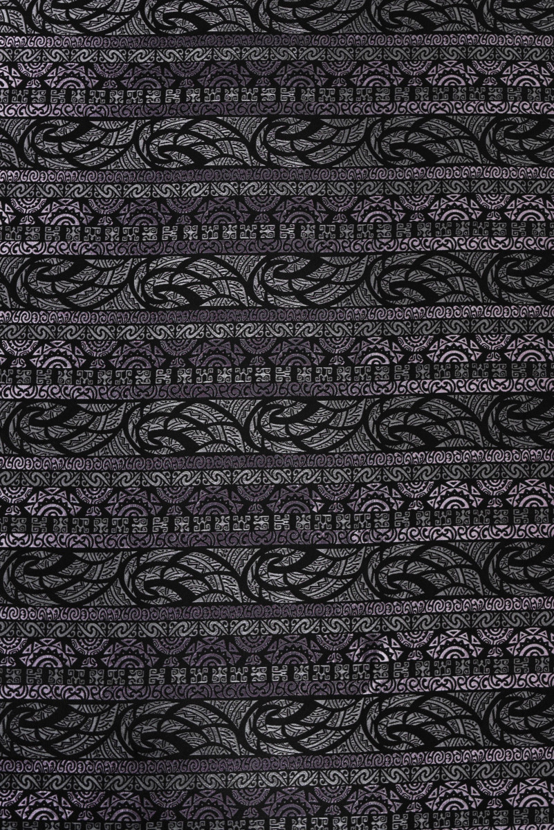 Olasz jacquard jelmezszövet keleti motívumokkal, amelyek 12 cm széles vízszintes csíkokat alkotnak. A fekete, a szürke és a piszkos lila gyönyörű kombinációja. A szövet háttere matt, a minta enyhén fényes. Az anyag vastagabb, merev, nem rugalmas, jellegzetes fényű. Tökéletes ruha, jelmez, szoknya varrásához vagy dekorációs célokra.