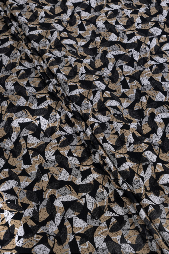 Olasz jacquard jelmezszövet fekete színben, díszes mintákkal szürke, bézs és écru színben. Vékony, enyhén merev anyag, twill szövéssel.