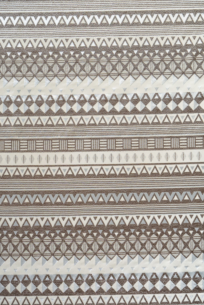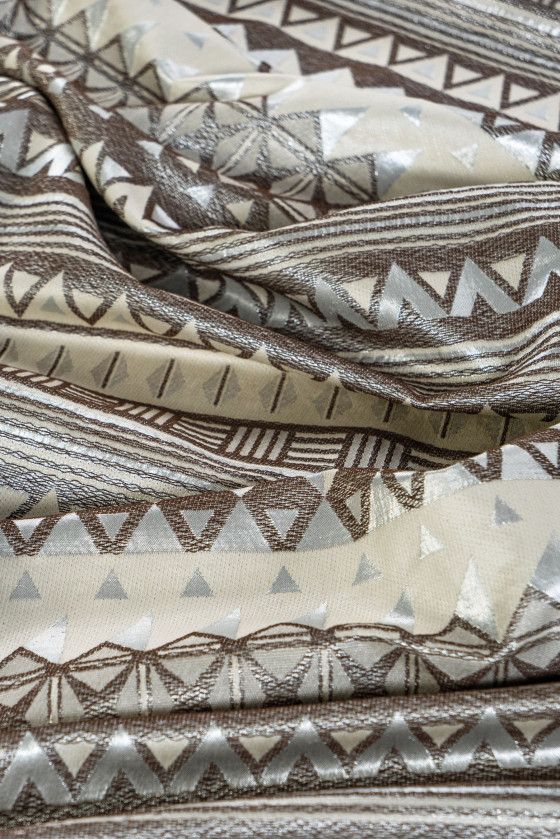 Olasz jacquard jelmezszövet kis geometriai mintákkal, bézs és barna színben, ezüst lurex szálral díszítve. A szövet vékonyabb, kissé merev.