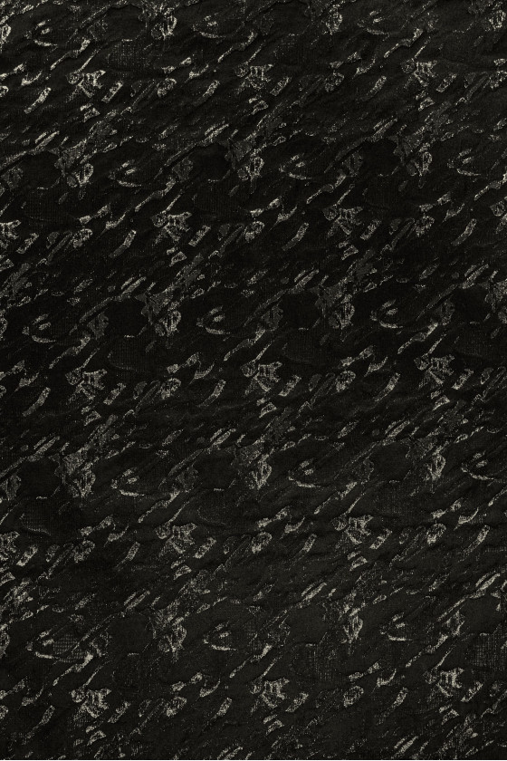 Olasz jacquard jelmezszövet fekete színben, díszes mintával, fekete és arany lurex szállal díszítve. Az anyag vékonyabb, merev, nem rugalmas, gyönyörűen fényes. Tökéletes jelmez, ruha, szoknya varrásához vagy dekorációs célokra.