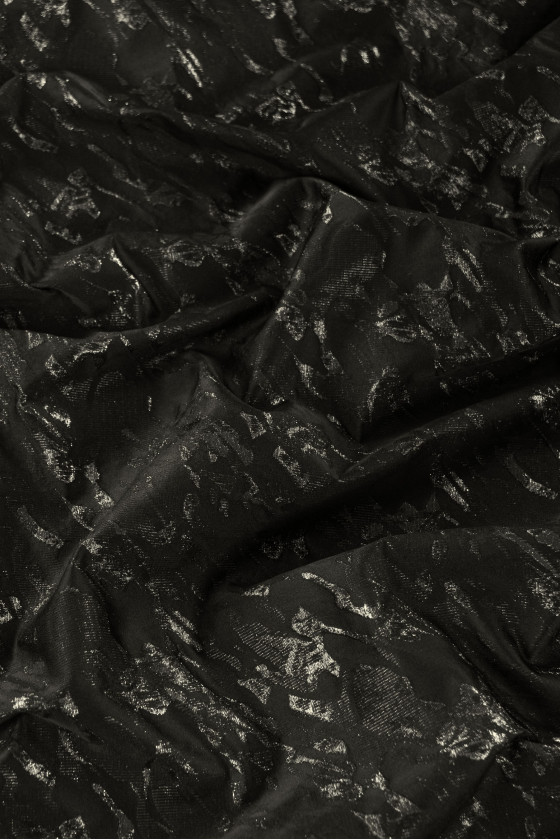Olasz jacquard jelmezszövet fekete színben, fekete és arany lurex szállal díszített díszes mintával. A szövet vékonyabb, merev, nem rugalmas, gyönyörűen fényes.