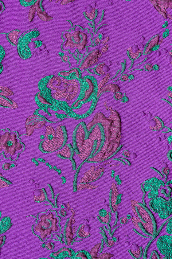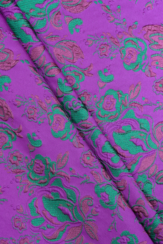 Olasz jacquard jelmezszövet sűrű szövött virágokkal, közepes méretű, zöld és rózsaszín, a minta kissé domború. Az anyag divatos fukszia színben készül, vékony és puha, érdekes javaslat ruha, szoknya vagy kabát varrására.