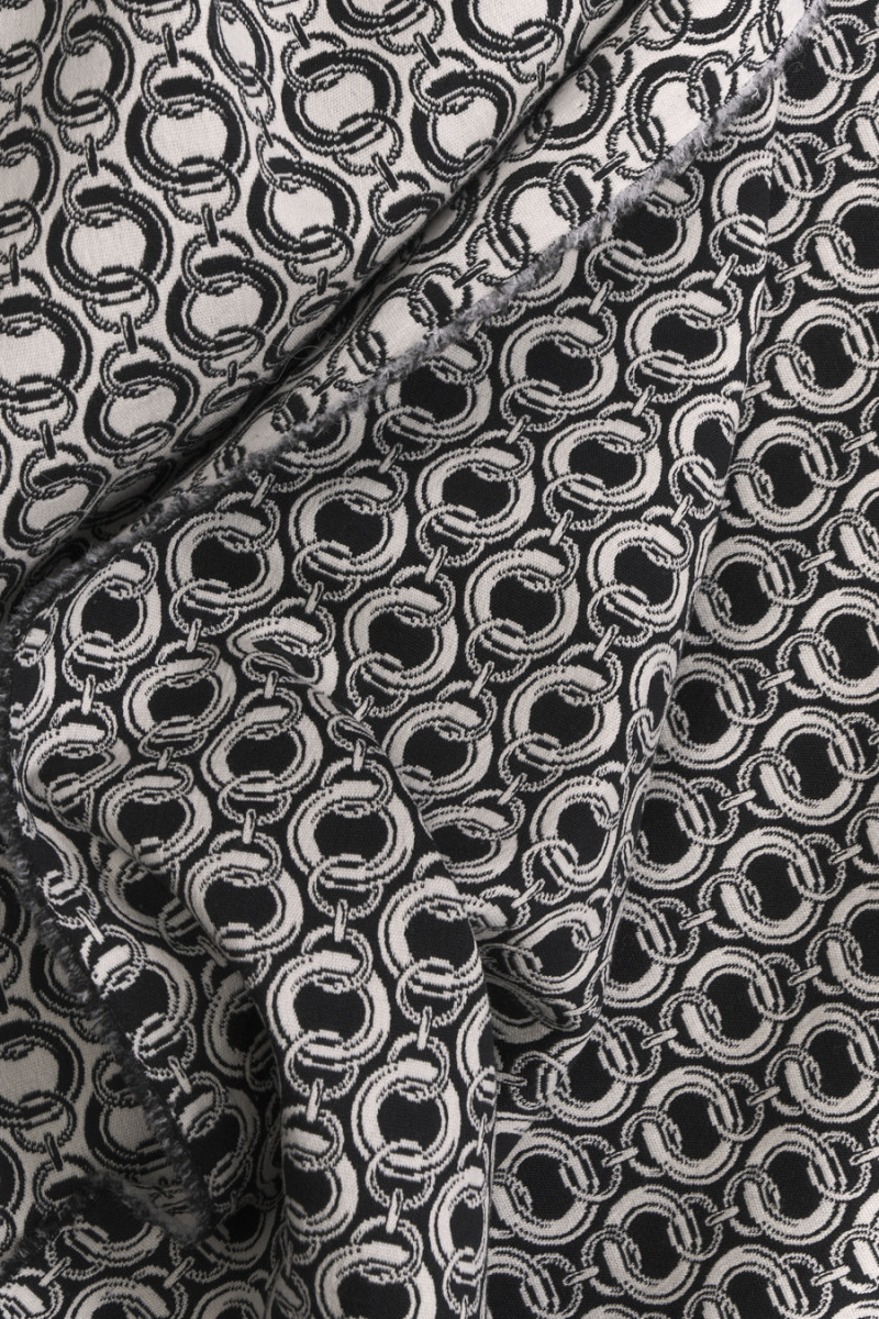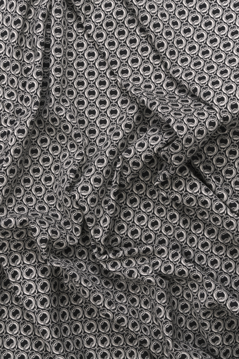 Olasz jacquard jelmezszövet, amely fekete alapon krémláncokat ábrázol. A minta sűrű és szabályos, a nagyobb körök 1,5 cm méretűek. A szövet puha, rugalmas, átlátszatlan és kétoldalas. Tökéletes jelmez, ruha, szoknya és nadrág varrására.