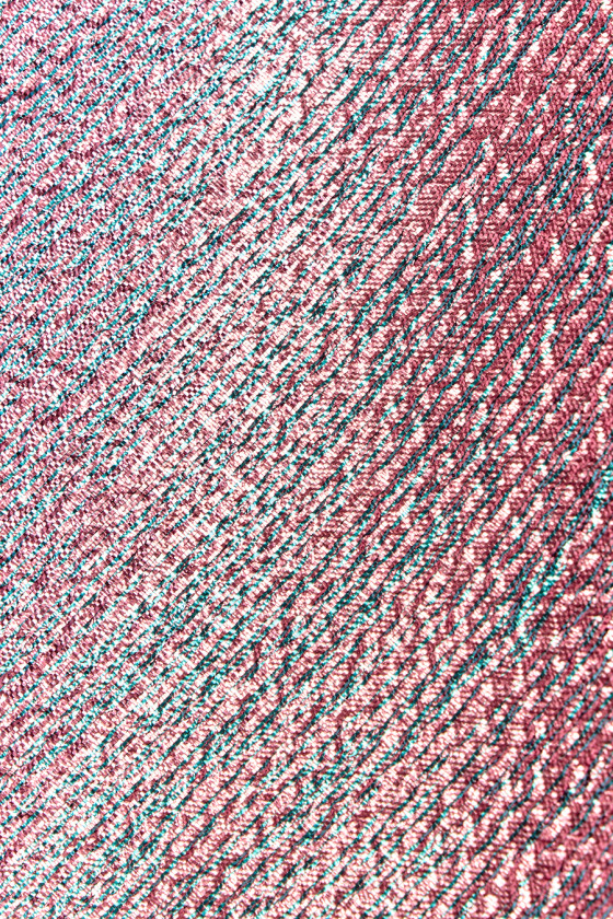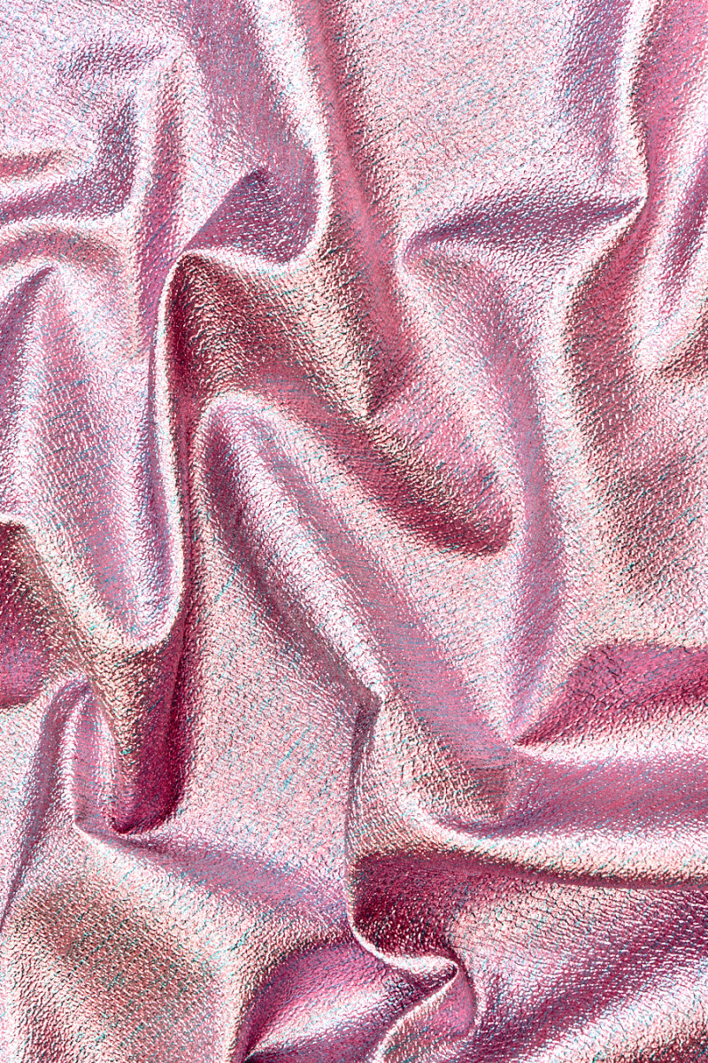 Olasz jacquard jelmezszövet világos rózsaszín és türkiz fémszálral. Közepes vastagságú anyag, nem rugalmas, merev, gyönyörűen fényes. Tökéletes estélyi ruhákhoz.