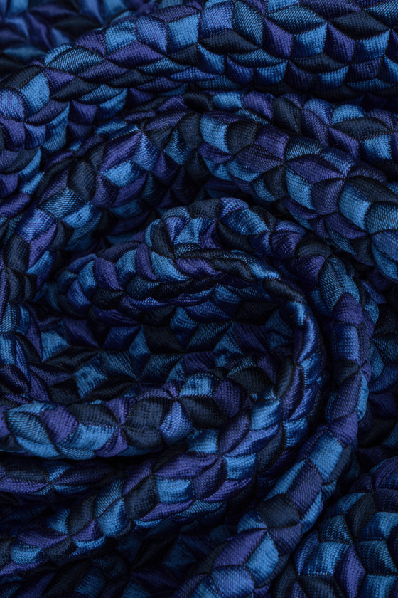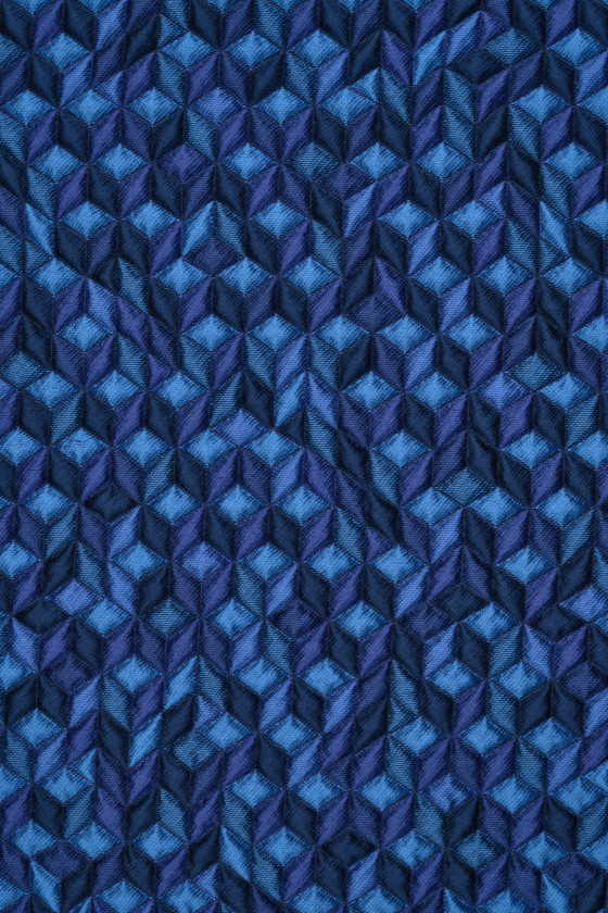 Olasz jacquard szövet kicsi, domború kocka motívummal, kék, sötétkék és lila színben. Szabályos minta, amely apró, 8 mm * 8 mm méretű rombuszból áll, érdekes 3D hatást keltve. A szövet közepes vastagságú, húsos, rugalmatlan, különálló konvex szerkezetű és enyhén merev fekvő. Érdekes ajánlat szoknyákhoz, kabátokhoz, valamint vékony kabáthoz vagy kabáthoz.