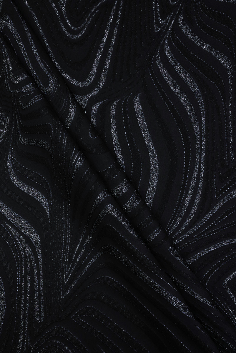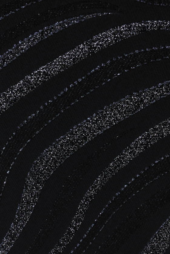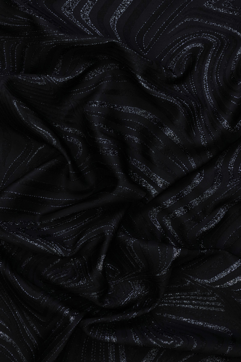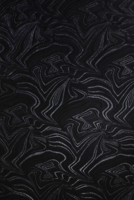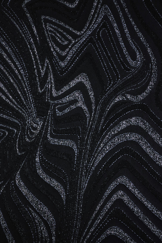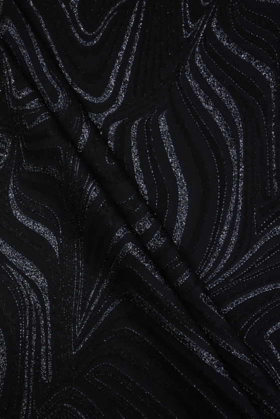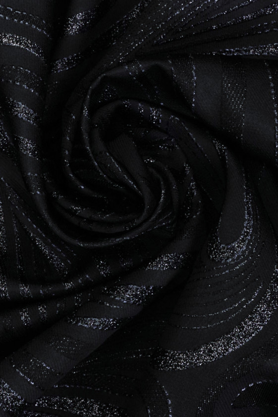 Olasz jacquard szövet fényes fekete hullámok motívumával fekete alapon. Az anyag vékony, de teljesen átlátszatlan, meglehetősen puha, nem rugalmas, könnyű és nagyon hatékony. Javasoljuk a bélés használatát. Tökéletes hivatalos ruhákhoz, például ruhákhoz és szoknyákhoz. Kabátokkal, kabátokkal vagy könnyű kabátokkal is jól működik. Különböző színváltozatok állnak rendelkezésre.