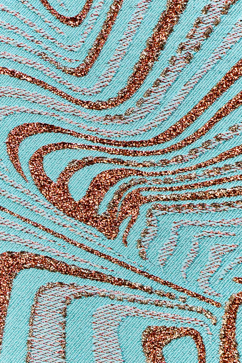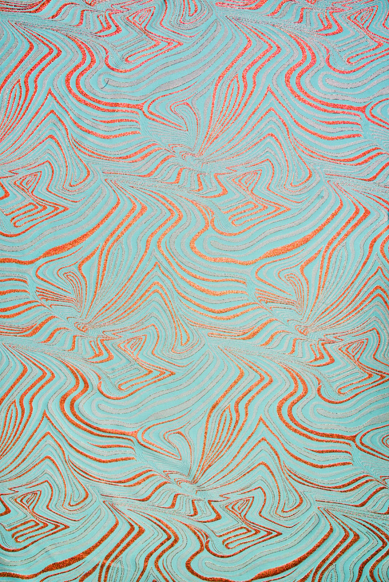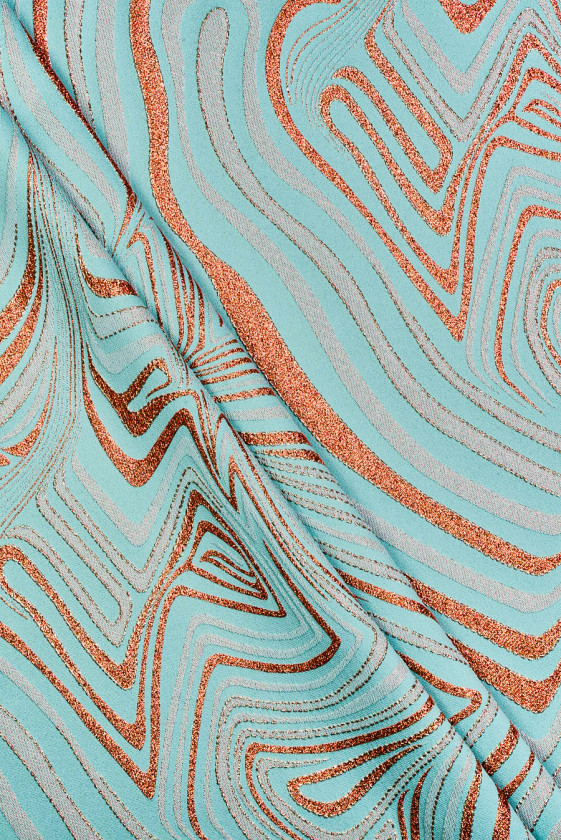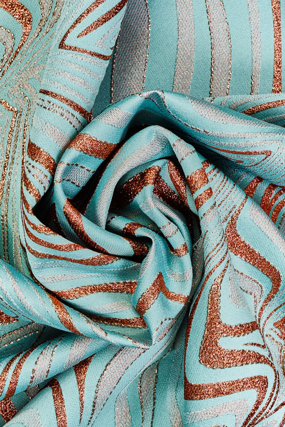 Olasz jacquard szövet fényes, réz hullámok motívumával, világos zsálya alapon. Az anyag vékony, de teljesen átlátszatlan, meglehetősen puha, nem rugalmas, könnyű és nagyon hatékony. Javasoljuk a bélés használatát. Tökéletes hivatalos ruhákhoz, például ruhákhoz és szoknyákhoz. Kabátokkal, kabátokkal vagy könnyű kabátokkal is jól működik. Különböző színváltozatok állnak rendelkezésre.