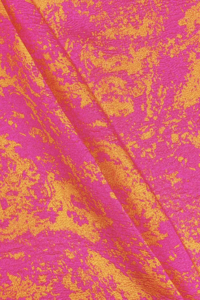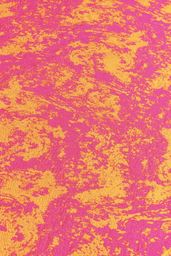 Jacquard szövet érdekes, absztrakt mintával szőtt két színű szálból: rózsaszín és narancssárga. A szabálytalan motívumok tiszták és meglehetősen nagyok. A szövet vékony, de átlátszatlan, rugalmatlan, kissé merev elrendezésű, mint a taft, gyönyörű fényű és finom, domború szerkezetű. Egyedülálló anyag, amely tökéletes estélyi ruhákhoz, például ruhákhoz, szoknyákhoz vagy kabátokhoz. Dekoratív anyagként is jól fog működni.