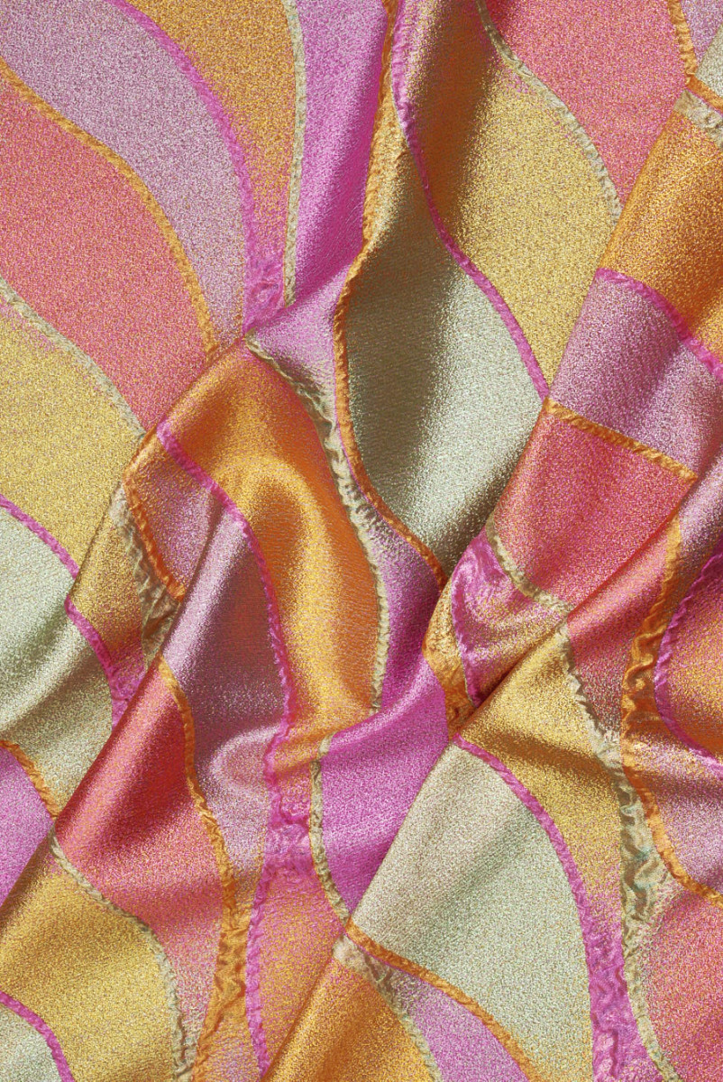 Jacquard szövet színes ólomüveg ablakra emlékeztető motívummal. Meglehetősen nagy, szabályos minta, amely domború hullámokból áll, ahol a köztük lévő tereket fényes szálak töltik ki, amelyek finom szerkezetet alkotnak. Az egész rózsaszín, narancssárga és világoszöld árnyalatokban készül. Az anyag vékony, de átlátszatlan, könnyű, rugalmatlan, az elrendezés kissé merev, de puha a markolat. Egy eredeti, friss, nyári színekben készült ajánlat tökéletes lesz ruhákhoz, szoknyákhoz, kabátokhoz és még könnyű kabátokhoz is.