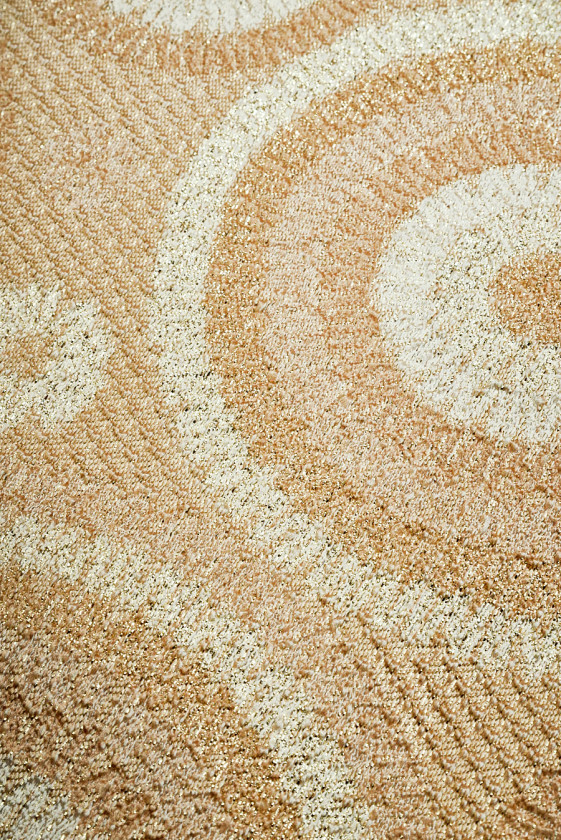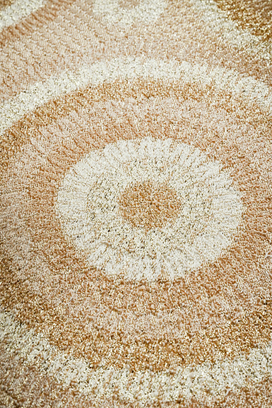 Jacquard szövet bézs színű rozetta motívummal, különböző méretekben, bézs alapon. Sűrű, szabályos minta világos és sötét bézs színű cérnából, az egészet fényes aranyszál díszíti. A legnagyobb rozetta 19 cm széles, a kisebbek 11 cm, 8 cm és 4 cm szélesek. Az anyag meglehetősen vékony, de átlátszatlan, nem rugalmas, könnyű és kissé mereven illeszkedik. Egyedülálló anyag, visszafogott színben, amely tökéletes lesz ruhákhoz, szoknyákhoz, kabátokhoz vagy könnyű kabátokhoz.
