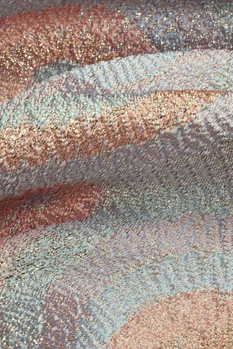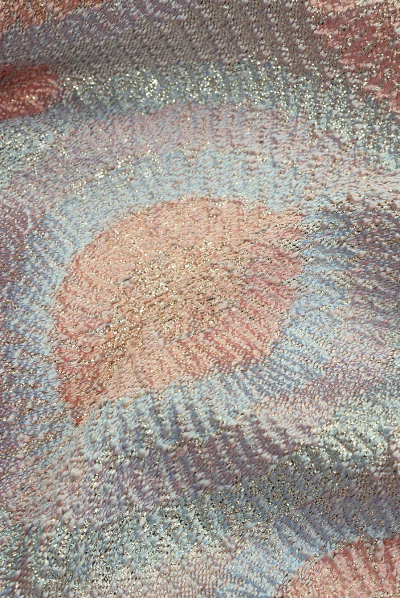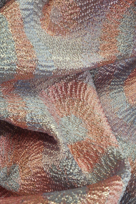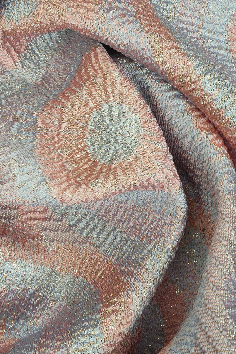 Jacquard szövet pasztell rozetták motívumával, különböző méretben, világos alapon. Sűrű, szabályos minta pasztellkék, lila és lazacrózsaszín cérnából, az egészet fényes aranyszáll díszíti. A legnagyobb rozetta 19 cm széles, a kisebbek 11 cm, 8 cm és 4 cm szélesek. Az anyag meglehetősen vékony, de átlátszatlan, nem rugalmas, könnyű és kissé mereven illeszkedik. Egyedülálló anyag, amely tökéletes ruhákhoz, szoknyákhoz, kabátokhoz vagy könnyű kabátokhoz.