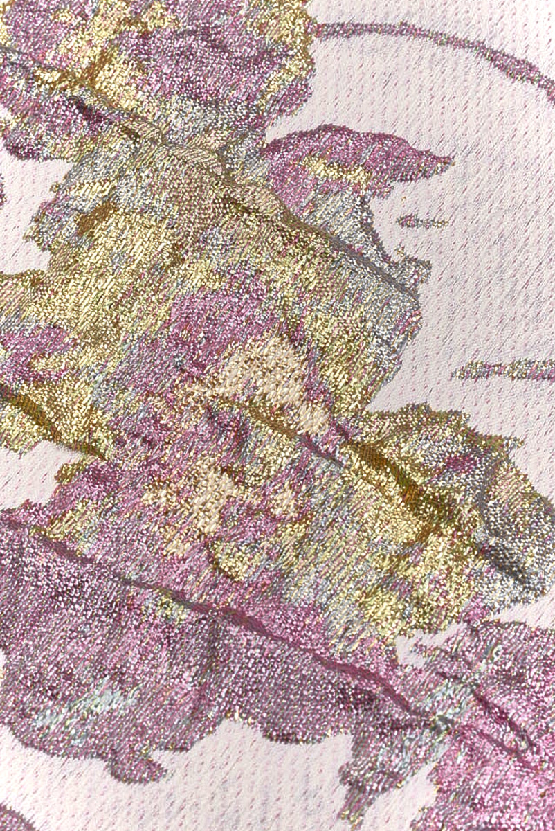Jacquard szövet virág alakú motívummal, pasztell rózsaszín, világoszöld és arany színben, nagyon világos rózsaszín matt alapon. Sűrű és domború minta, ahol egyetlen elem körülbelül 7 cm * 8 cm nagyságú, és fényes szálakból készül. Az anyag meglehetősen vékony, de átlátszatlan, rugalmatlan, puha a markolatban és kissé mereven illeszkedik. Romantikus ajánlat, amelyből ruhákat, szoknyákat, kabátokat, mellényeket készíthet.