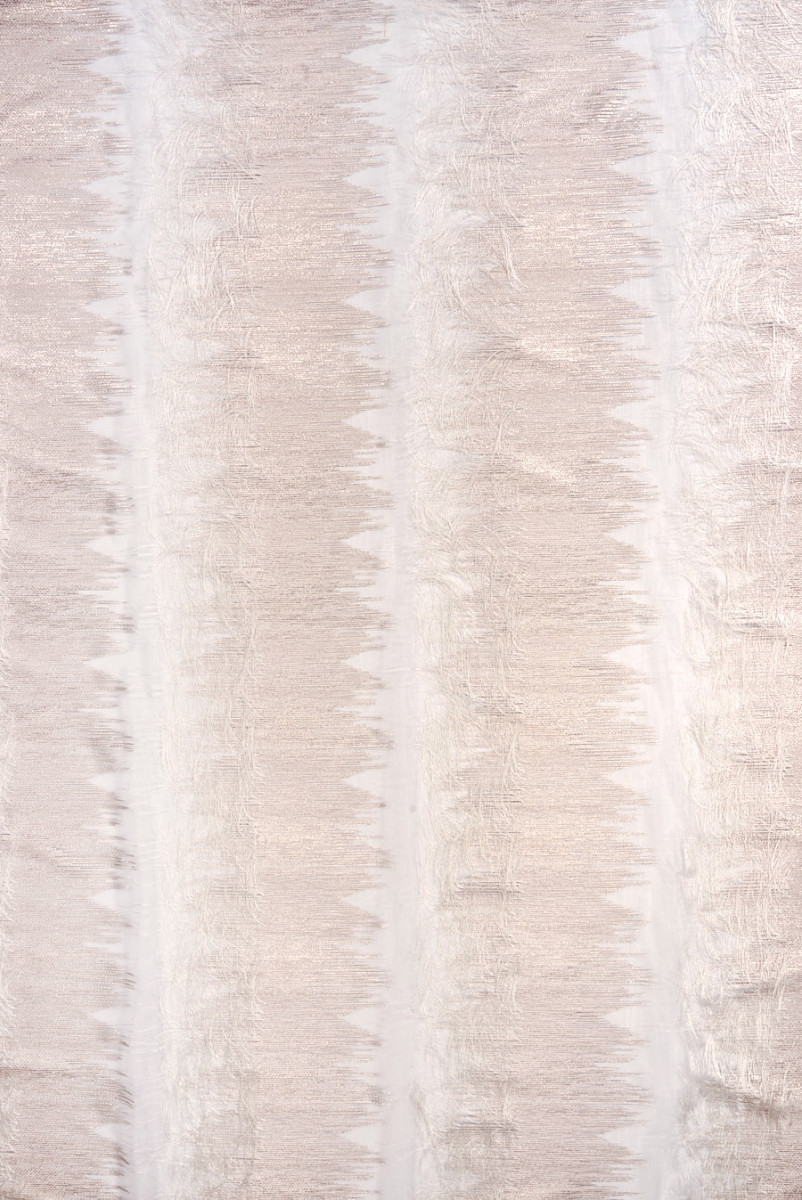 Krémszínű organza poliészter szövet jacquard motívummal, amely sűrűn elrendezett, különböző hosszúságú vonalakat ábrázol krémszínben. A 30 cm szélességű szabályos mintákat a legszélesebb ponton 8 cm-es időközönként megismételjük, és gazdagon díszítjük fényes rózsaarany cérnával, ami érdekes, enyhén rózsaszín színt kölcsönöz az anyagnak. Minden motívumot kb. 9 cm hosszú bojtokkal készítünk. A rojtok elrendezése miatt kerületi varrást javasolunk. Az anyag vékony, szőtt minta nélküli helyeken átlátszó, rugalmatlan, kissé mereven illeszkedik, de a rojtnak köszönhetően szép légiességet kap. Ezt az egyedülálló anyagot különösen ruhákhoz és szoknyákhoz ajánljuk.