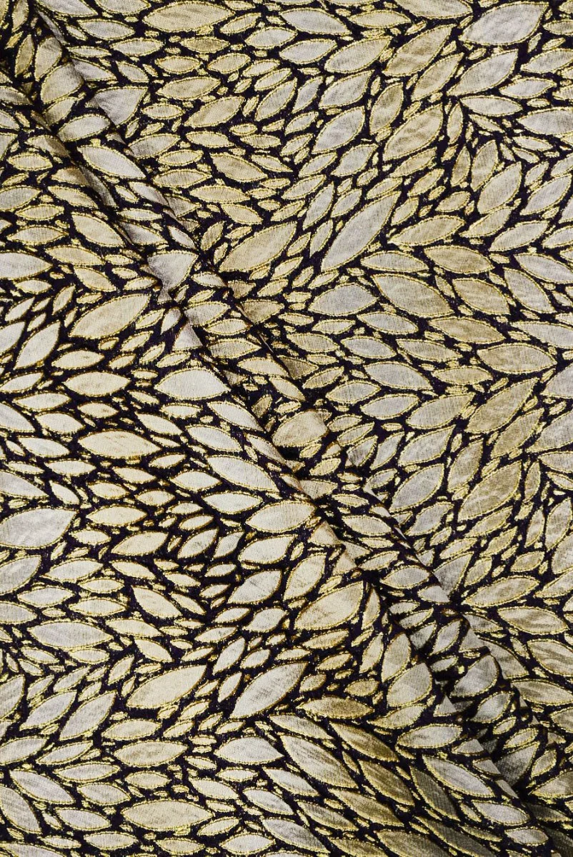 Poliészter jacquard szövet levél alakú motívummal, sötétkék színben, szinte fekete szegéllyel. A nagyon sűrűn elhelyezett motívumok különböző méretűek, a legkisebb 5 mm, a legnagyobb 5 cm, fényes cérnával vannak kitöltve, az arany két árnyalatában. A melegebb és hidegebb aranyat felváltva szövik 4 cm-enként, olyan csíkokat hozva létre, amelyek érdekes árnyékoló hatást kölcsönöznek. A sötétkék szegélyek viszont domborúak. Az anyag könnyű, rugalmatlan, közepes vastagságú és meglehetősen mereven illeszkedik. Használható estélyi ruhák, például ruhák, szoknyák, kabátok készítésére.