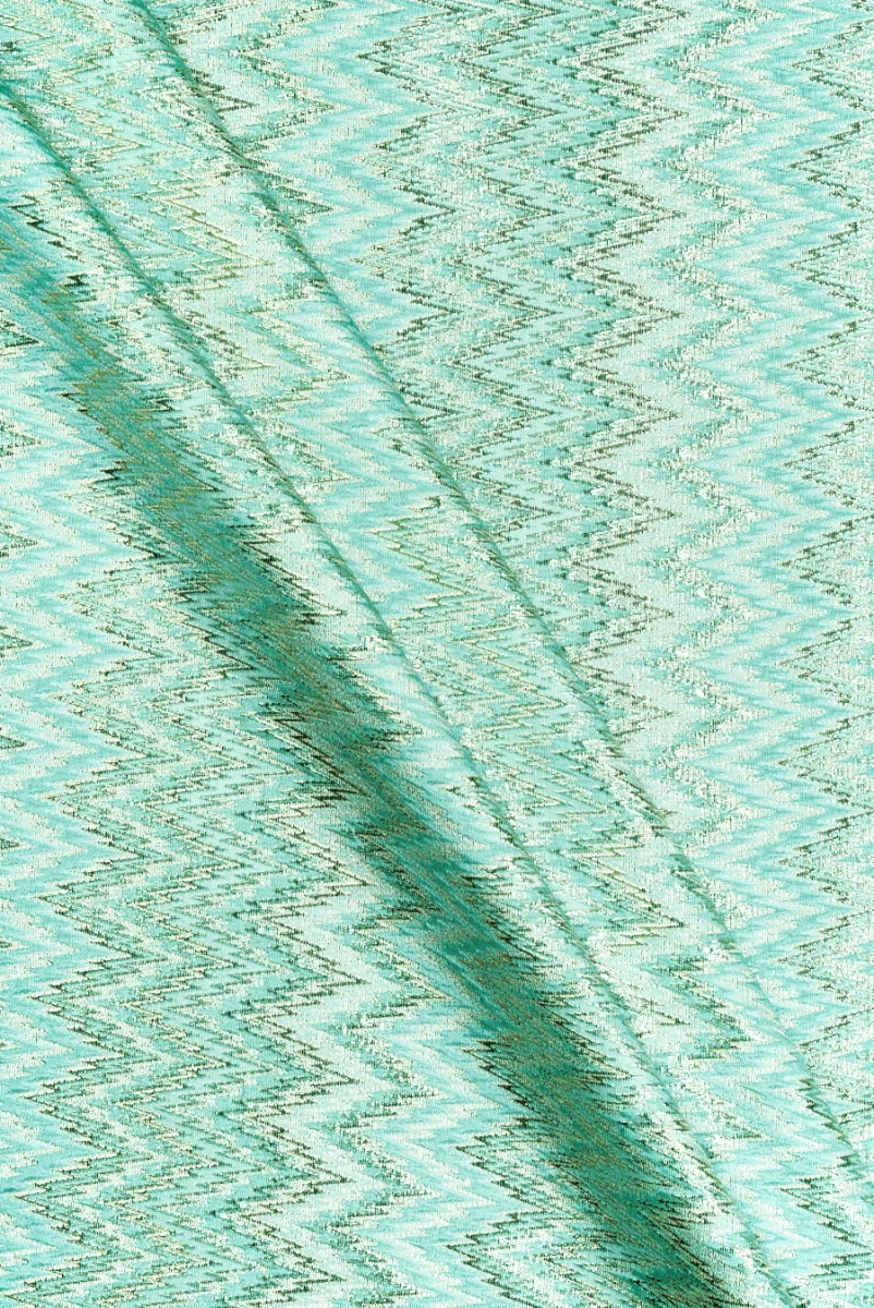 Olasz jacquard szövet mentaarany cikk-cakk motívummal. Szabályos, sűrű minta, gyönyörűen díszített aranyszállal. Az anyag közepesen vastag, enyhén merev, nem rugalmas és átlátszatlan. Hatékony és friss ajánlat, amelyből jelmezeket, szoknyákat, kabátokat vagy tavaszi kabátokat készíthet.