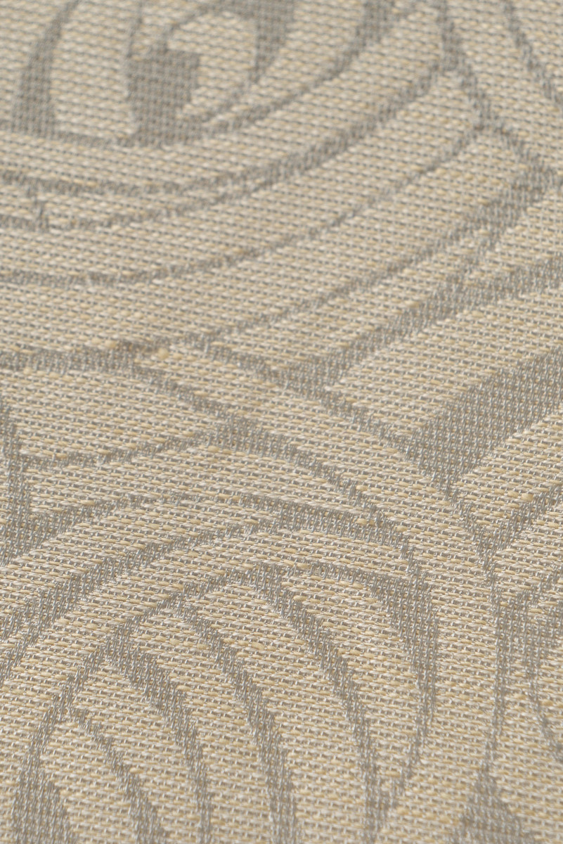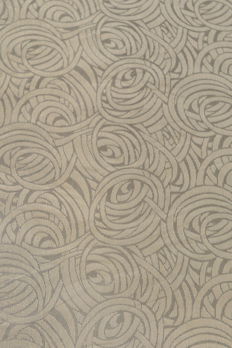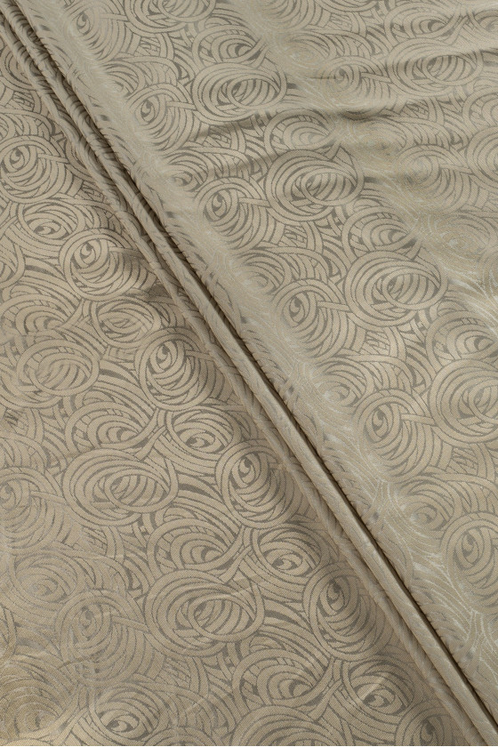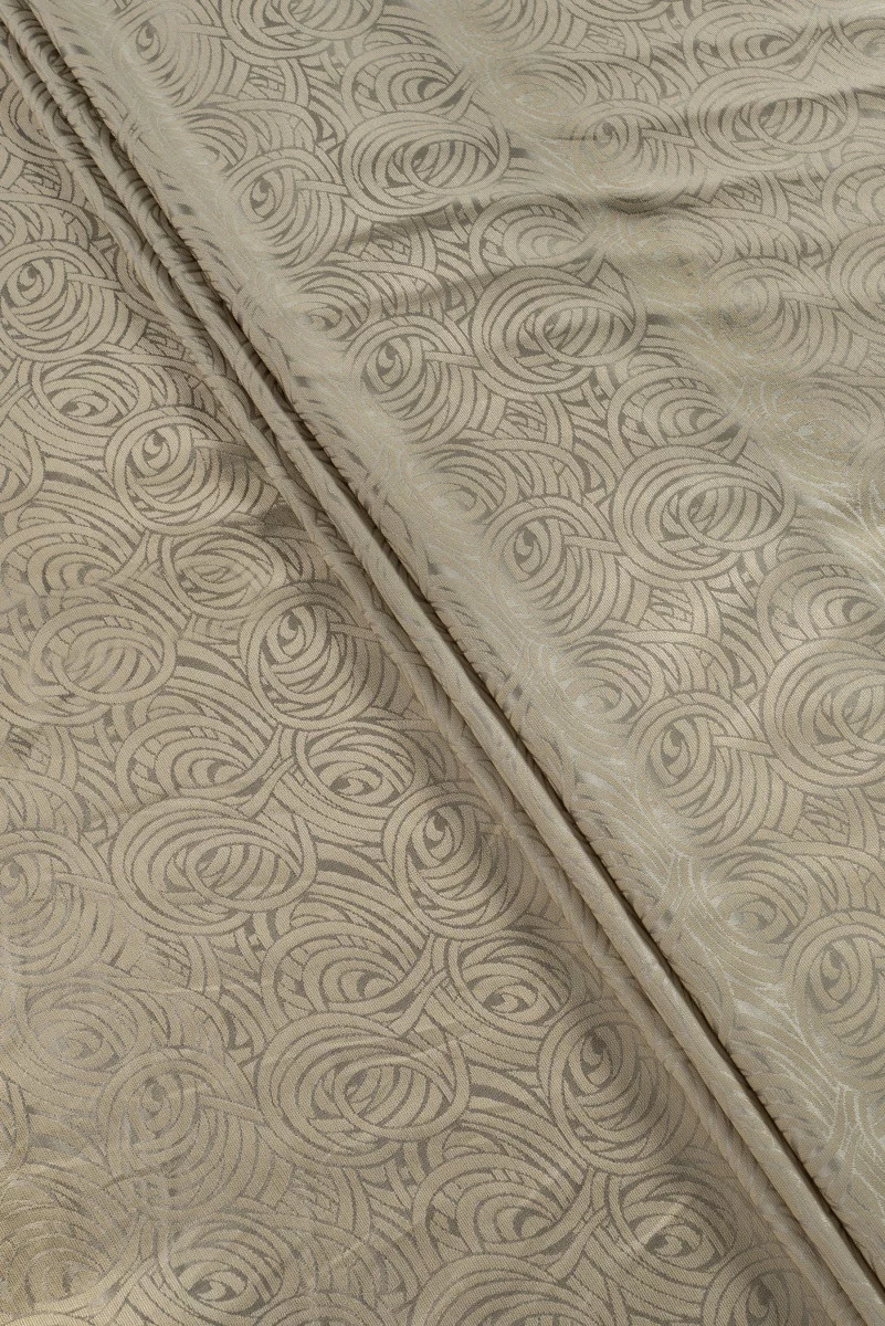 Viszkóz és poliészter szálakból szőtt jacquard szövet. A minta s-flores-t hoz létre bézs színben, ezüsttel tarkítva. Javasoljuk ruhák, jelmezek, vékony kabátok varrását, vagy belsőépítészeti szövetként való használatát.
