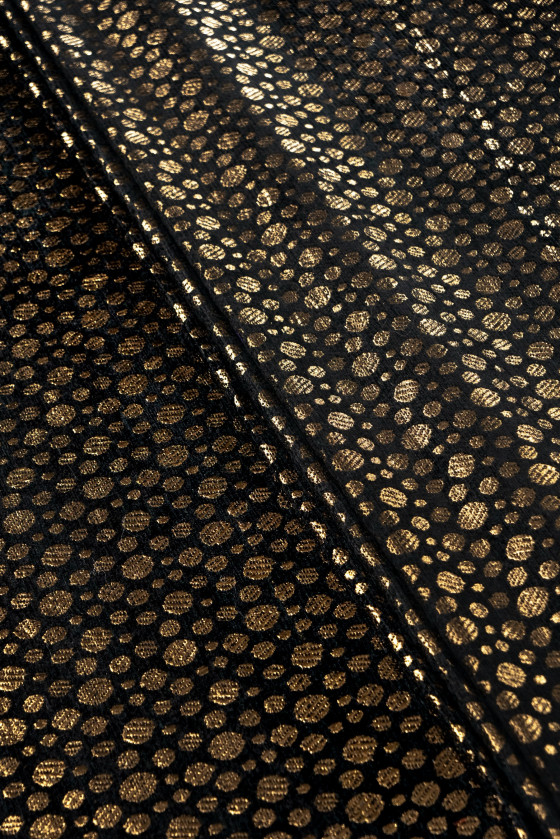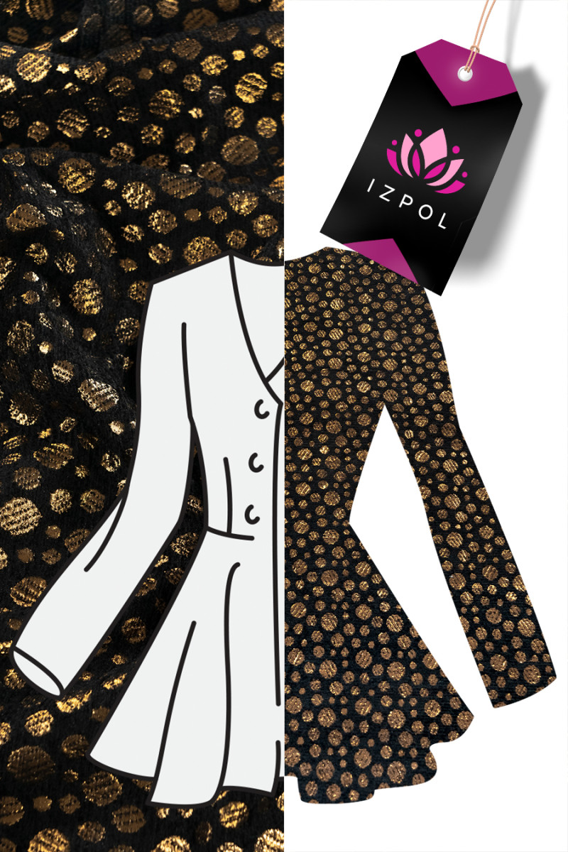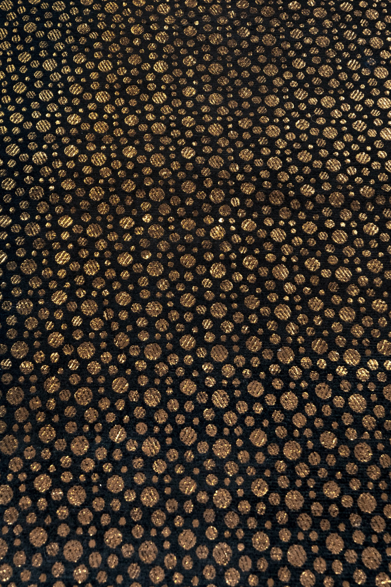 Kétoldalas jacquard. Az egyik oldalon fekete alapon réz minta, a másik oldalon réz alapon fekete minta található. Keskeny szövet 100 cm kabátokhoz vagy kabátokhoz.