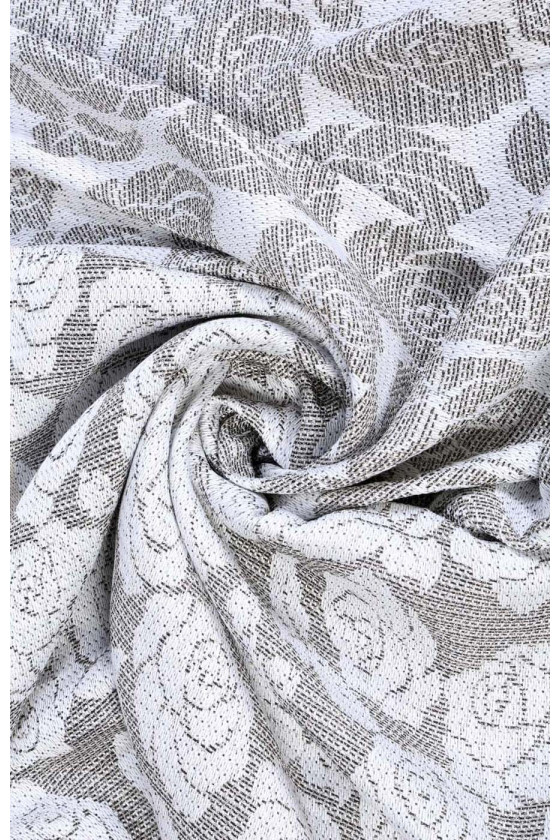 Pamut, viszkóz és poliamid keverékéből szőtt jacquard szövet, sűrű rózsavirág motívummal. Puha, rugalmatlan és nagyon hatékony. A szövet enyhén laza szövésű, ezüst szállal van befejezve. Nagyszerű ajánlat jelmezekhez, ruhákhoz vagy kabátokhoz.