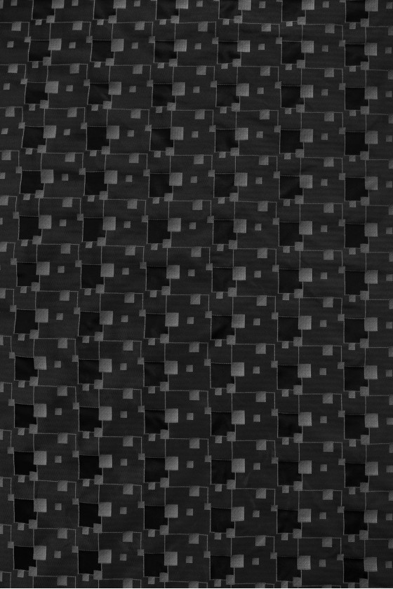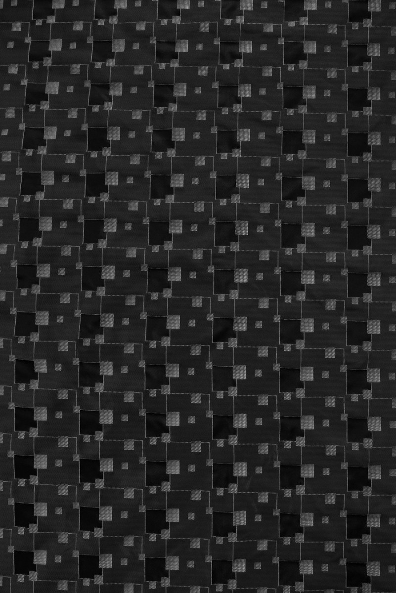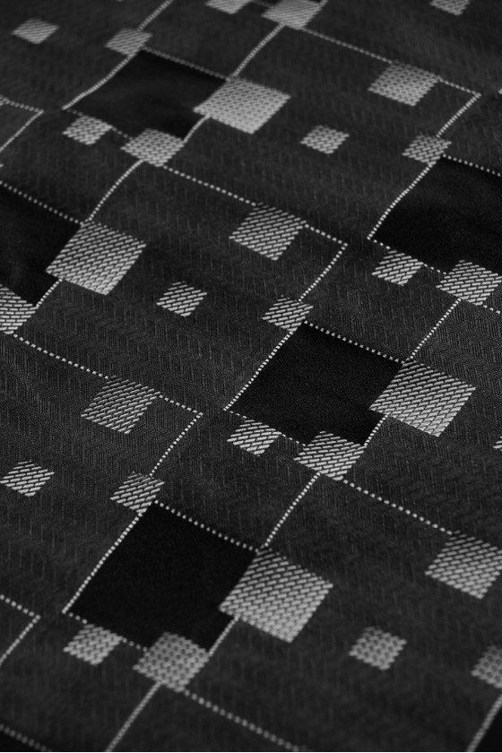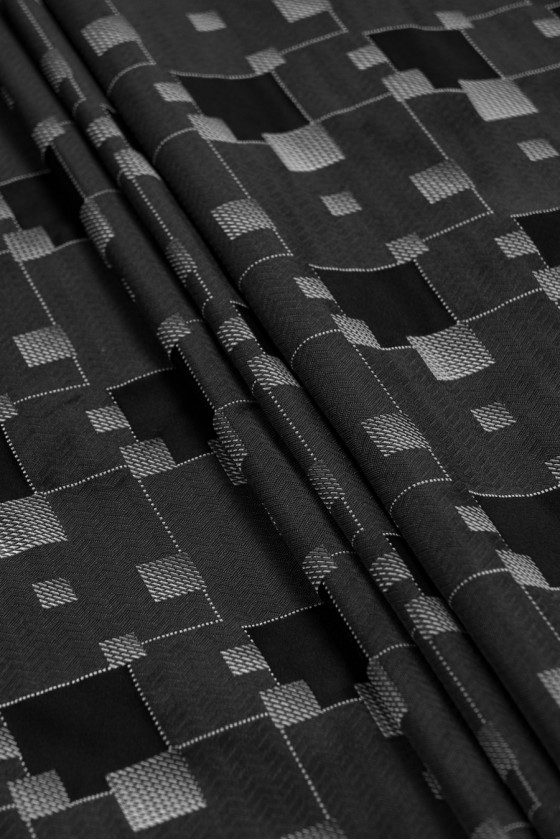 Jacquard geometriai mintában szőtt három színben - hamu, grafit és fekete. Az anyag kissé merev, nem rugalmas és vékony Tökéletes kabáthoz, ruhához vagy vékony kabáthoz.