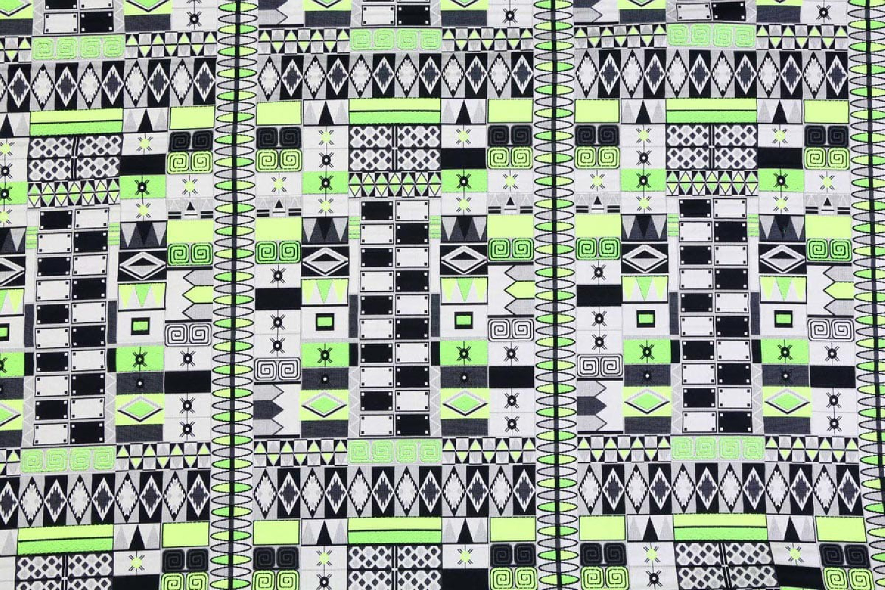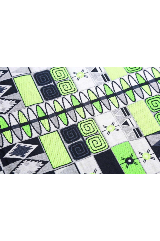 A geometriai mintázatú jacquard egy nem rugalmas anyag, amelyet ruhákhoz vagy jelmezekhez szántak. A zöld elemek nagyon intenzív színűek. Varrhat egy vékony kabátot is.