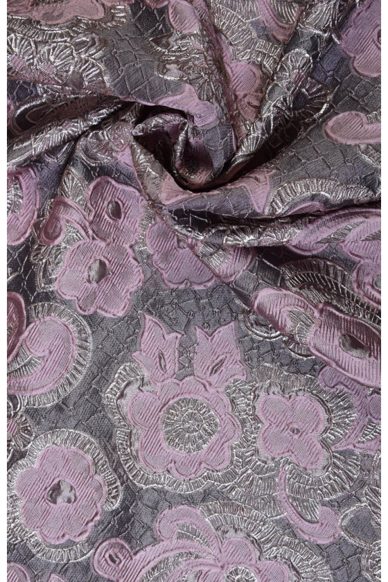 Nagyon gazdag jacquard jelmezszövet piszkos rózsaszínben és aranyban, egyik szélén virágmotívummal - az anyagot kerületileg varrják. A szövet puha, nem rugalmas, enyhén átlátszó.
