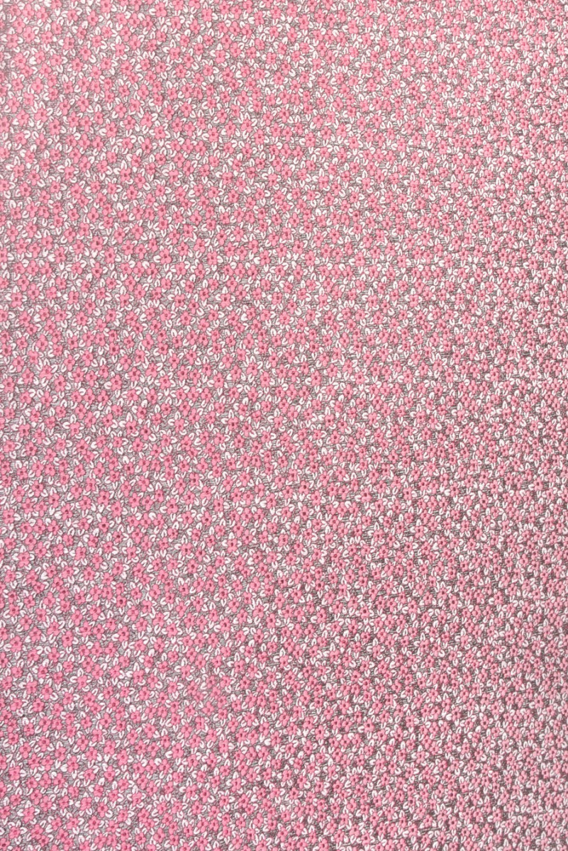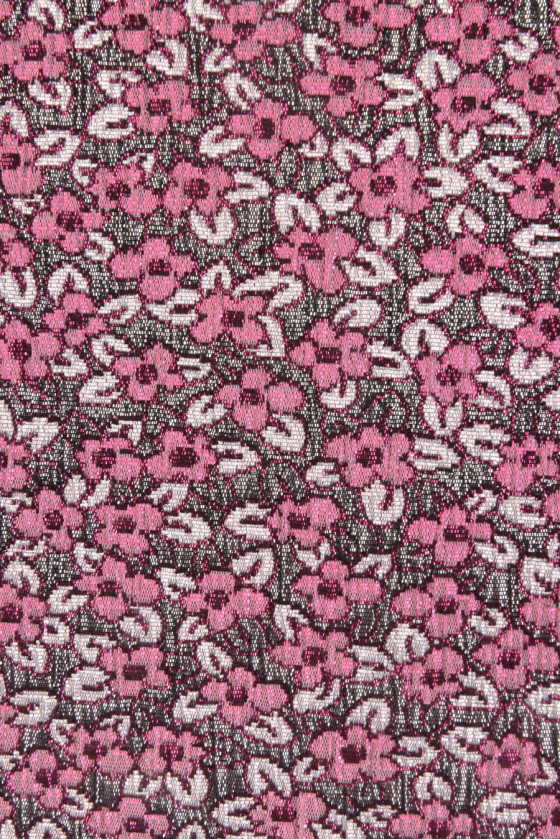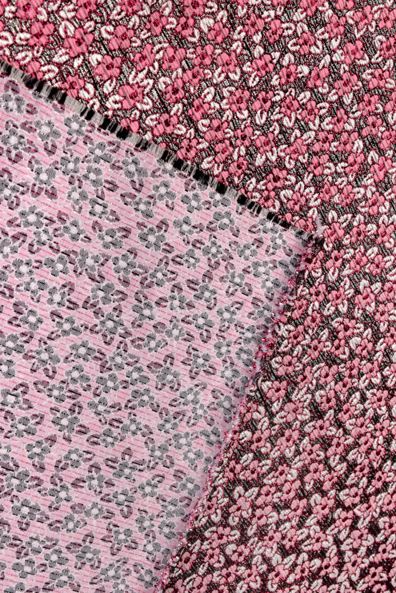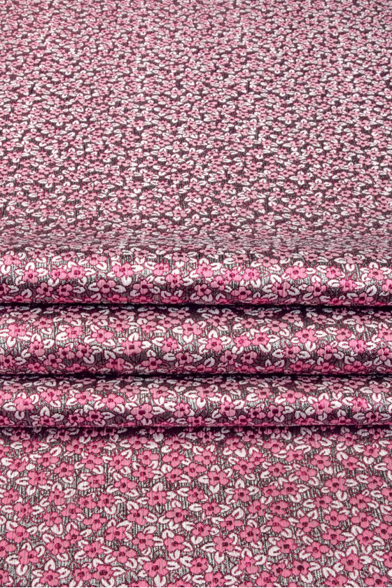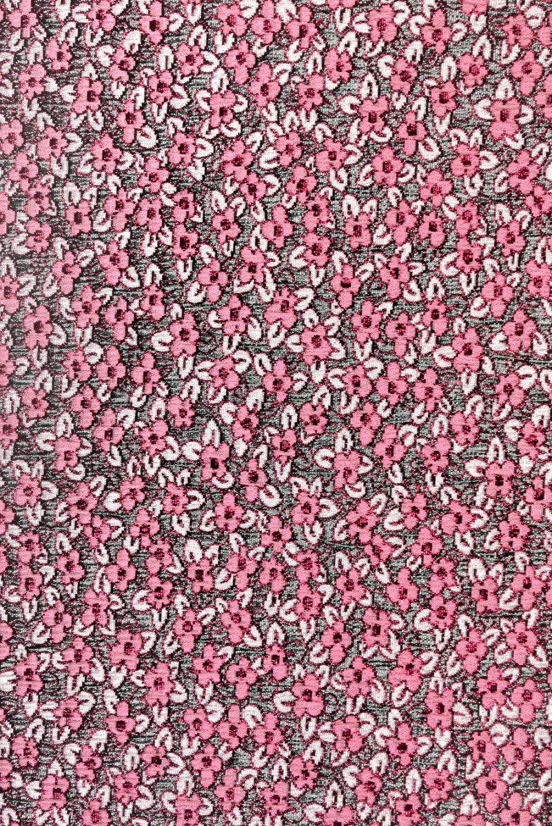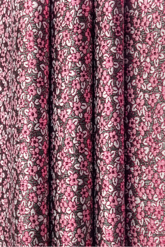 Jacquard kis rózsaszín virágokkal, fehér levelekkel, fekete alapon, ezüst és rózsaszín lurex szál hozzáadásával. Az anyag alakítható, ideális ruhák, szoknyák, kabátok, dzsekik varrására.