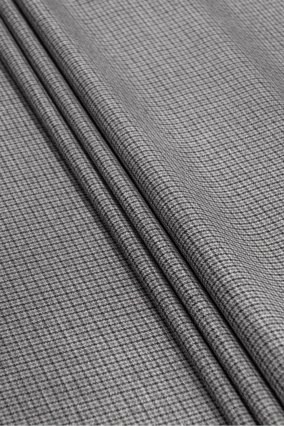 Közepes vastagságú olasz jelmezszövet. Finom ellenőrző motívum a következő színekben: fekete, szürke, grafit. 50% viszkózból és 50% poliészterből szőtt.