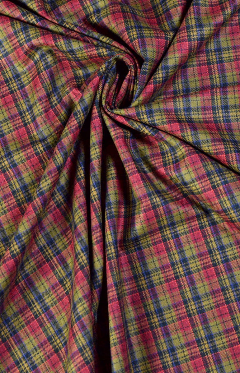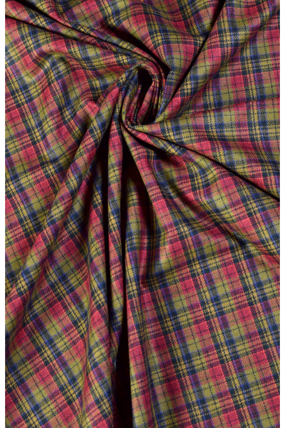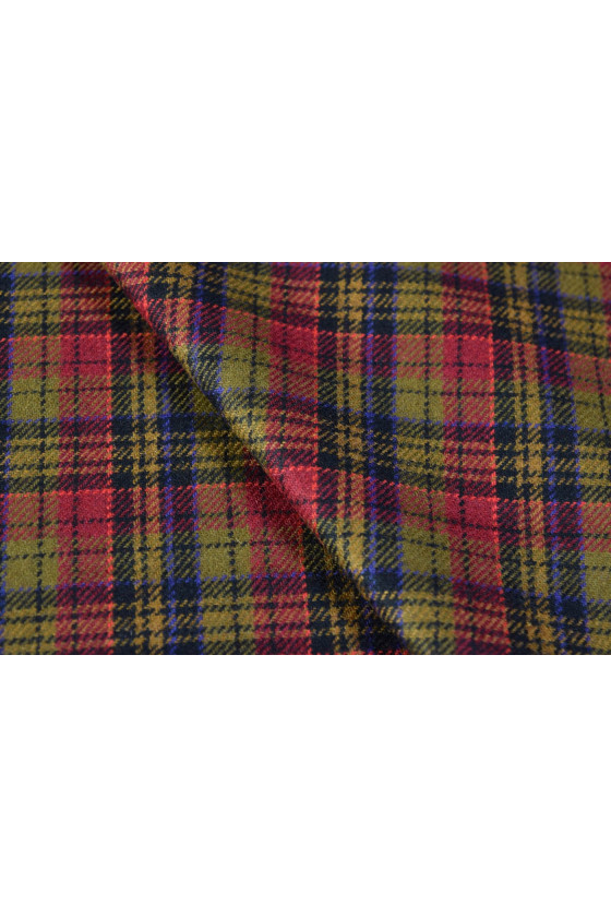 Gyönyörű kockás jelmezszövet ruhákhoz, szoknyákhoz, dzsekikhez. Természetes gyapjúból szőtt poliészter keverékével. A szövet nem rugalmas, közepes vastagságú. Vegytisztításra tervezték.