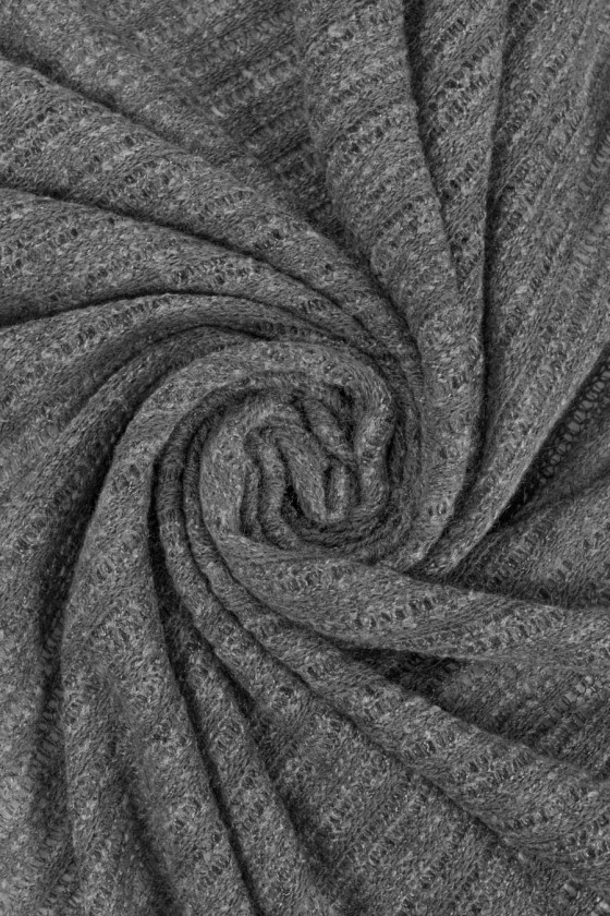 Olasz pulóver kötött anyag szürke színben, természetes gyapjúból szőtt, akril keverékével. Nagyon puha és kellemes tapintású, laza, áttört szövéssel. Tökéletes pulóver vagy téli sál varrásához.