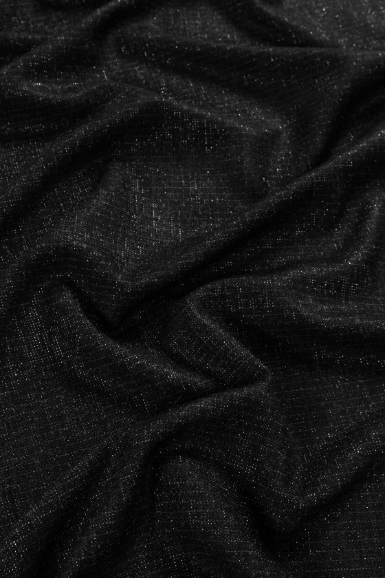 Olasz jelmez gyapjú fekete, 0,5 cm széles csíkokkal, gyönyörűen díszített ezüst lurex szál. Puha, húsos, nem rugalmas anyag, őszi-téli fajta.