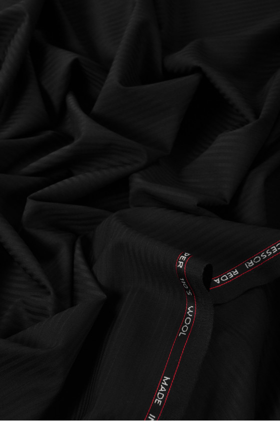 Olasz jelmez gyapjú fekete, 0,5 cm széles csíkokkal. Puha, klasszikus vastagságú, nem rugalmas anyag.